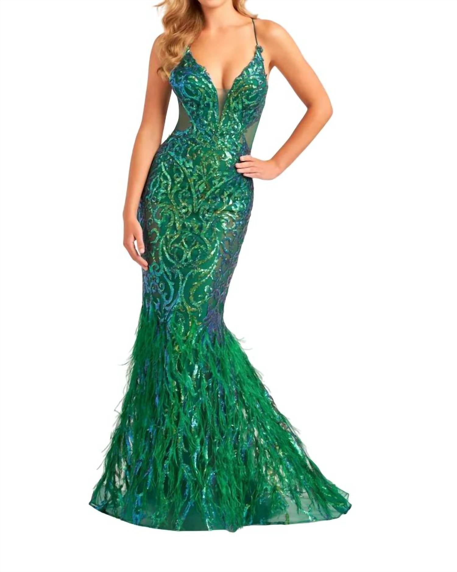 Just add a cute little clutch and a matching heel for the perfect event look. Shine with confidence in this captivating long gown made from dazzling sequin tulle. Designed in a flattering trumpet silhouette, it features a plunging V-neckline and a sleeveless cut for a sleek, modern edge. The lace-up low back adds a touch of drama, while side waist mesh insets accentuate your shape. Finished with delicate feather accents, this dress is perfect for making a bold and unforgettable entrance.