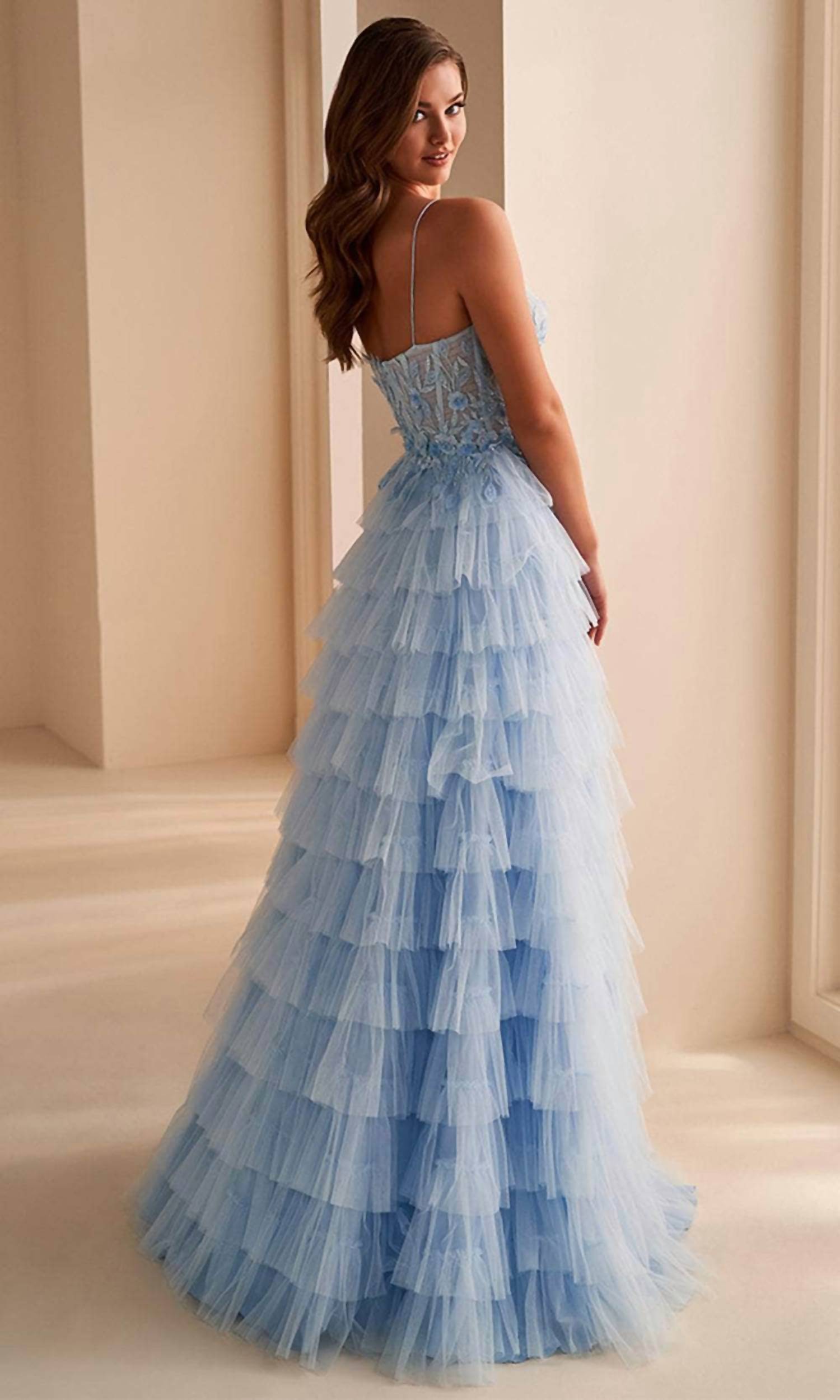 Turn heads in the cutest and most flattering evening dress. Turn heads in this stunning gown—a breathtaking blend of sophistication and intricate design. Adorned with shimmering sequins, fine beadwork, and sparkling stone accents, it also features exquisite three-dimensional floral appliqués for a touch of luxury. The sheer corset bodice, with its sweetheart neckline and delicate straps, creates a sleek and modern silhouette. A mid-open back adds subtle allure, while the floor-length tiered A-line skirt, complete with a leg slit and sweeping train, ensures a show-stopping entrance at any elegant event.
