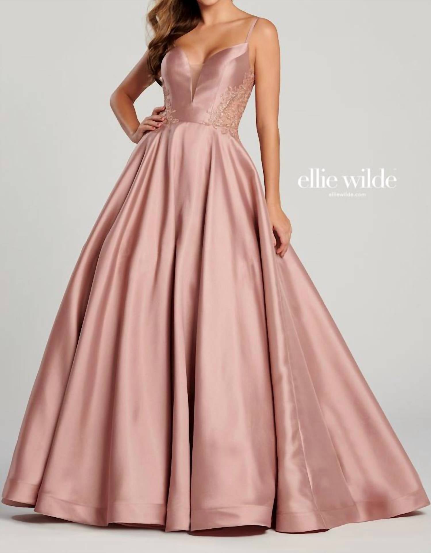 Just add a cute little clutch and a matching heel for the perfect event look. Introducing the Ellie Wilde Women's Prom Dress in an elegant rose gold hue, perfect for making a stunning entrance this spring prom season. This quiet luxury piece boasts a classic A-line silhouette and a flattering sweetheart neckline, complemented by delicate spaghetti straps. Closure: Zip closure. Ideal for prom, this solid-pattern gown offers timeless style without pockets.