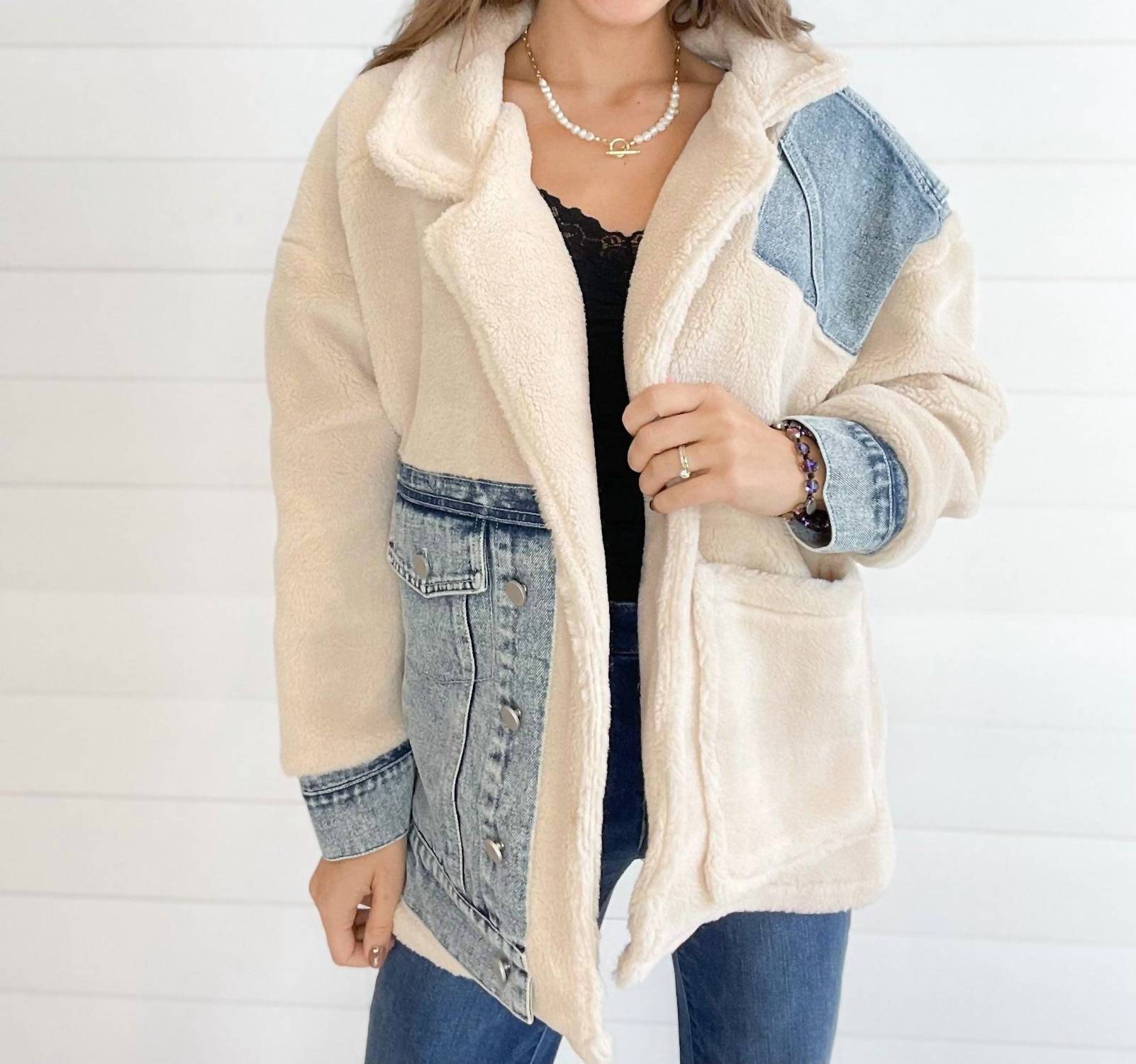 A jacket so versatile you can literally wear it with anything. Introducing the Mixed Media Sherpa Denim Jacket by ELLISON, an essential for your fall wardrobe. This hip-length jacket boasts long sleeves and a stylish open front, featuring a blend of light wash denim patches and wool fabric for a chic, textured appeal. With oversized front pockets for added convenience, this cream-colored piece is perfect for vacation getaways or streetwear occasions. Care instructions are simple: machine wash cold and line dry for effortless upkeep.