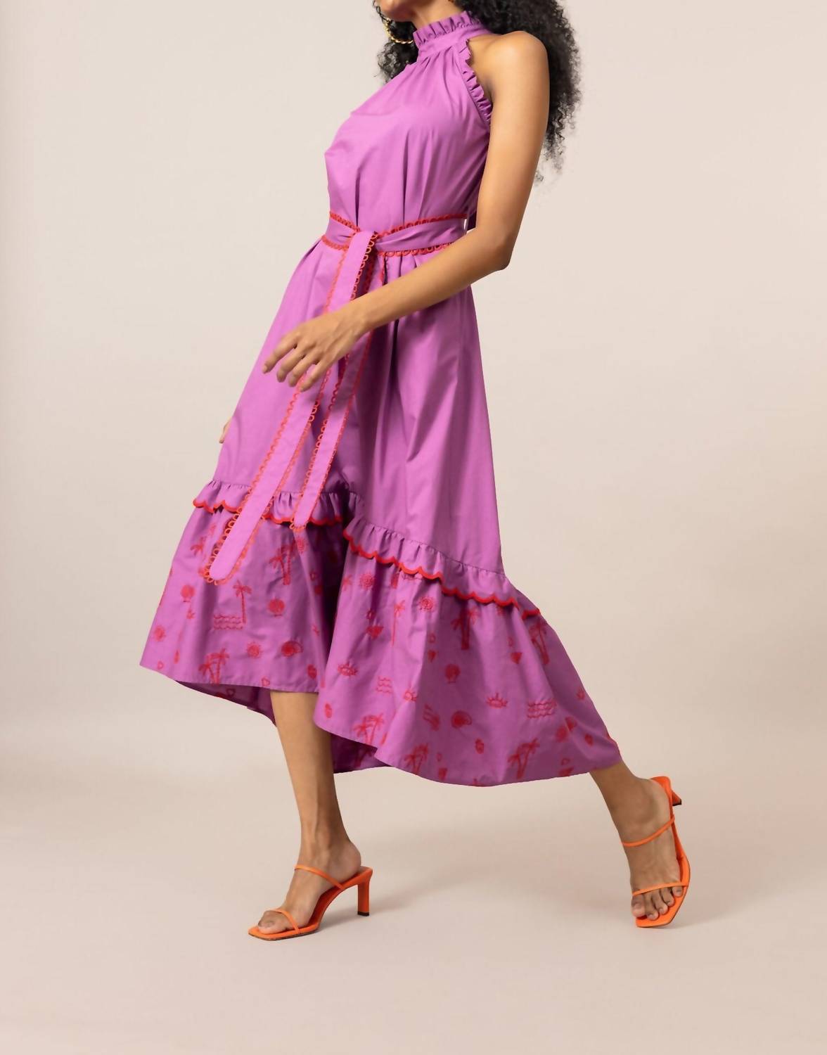 Experience effortless boho chic with the EMILY LOVELOCK Celine Dress in Mulberry, an enchanting blend of purple and red hues. This sleeveless dress, crafted from 100% cotton, boasts a tiered silhouette with an embroidered beach motif along the bottom tier and charming ruffle details at the high neckline. The self-tie waist belt with contrasting scalloped trim and a delicate bow closure at the back of the neck enhance its feminine appeal. Perfect for summer occasions, this midi to maxi length dress is lined for comfort and style.