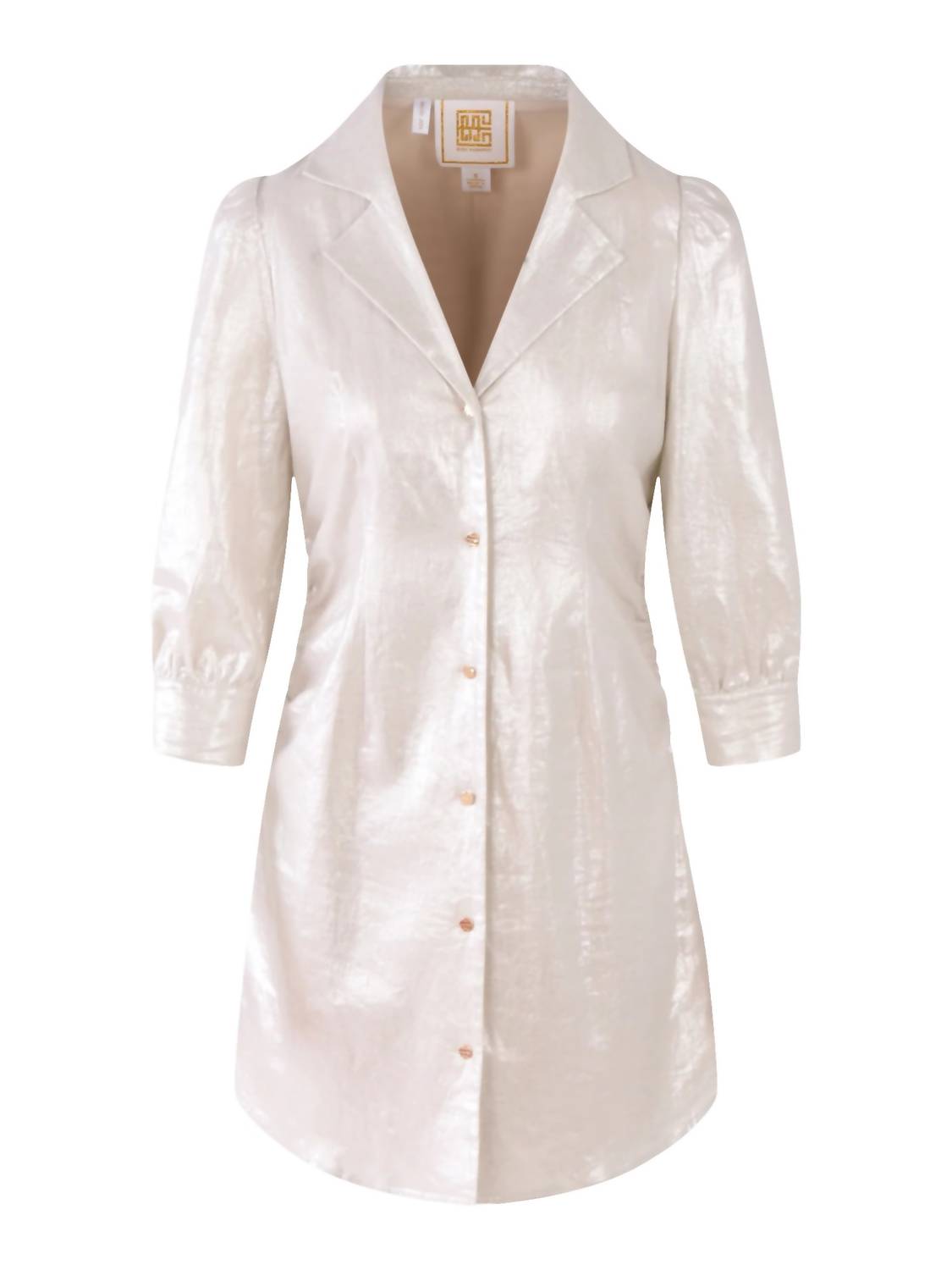 A short and breezy dress for those warmer days. Elevate your holiday party look with the Felicity Mini Dress by Emily McCarthy in platinum, a stunning solid shirt dress with a touch of quiet luxury. Featuring three-quarter sleeves and crafted from a luxe linen blend of 55% Linen and 45% Viscose, this mini dress boasts a flattering silhouette and side ruching for added flair. Complete with a classic lapel and signature gold button closure, it's lined with 100% Polyester for comfort. Care instructions include hand washing with gentle detergent in cold water and line drying to maintain its elegance.