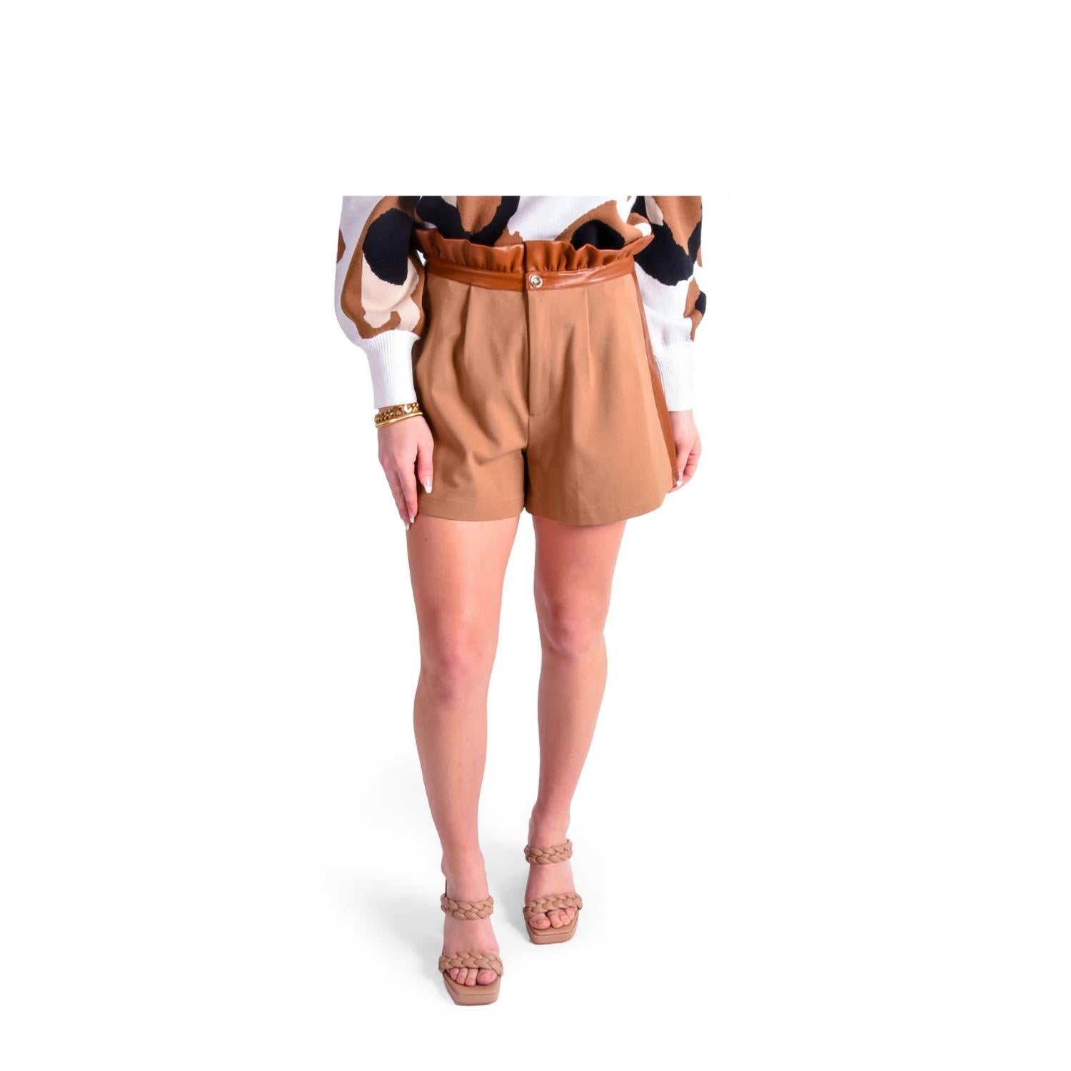 Fit to perfection, we love these high-waist shorts and you will too. Introducing the Ruffle High Waist Short by Emily McCarthy, a chic staple for spring workwear. These tan ponte shorts are crafted from a comfortable blend of 65% Rayon, 30% Nylon, and 5% Spandex, offering a flexible fit. Featuring a stylish high-rise ruffle top and vegan leather detailing, they include convenient pockets and a button closure. Hand wash for best care. The shorts run slightly larger; sizing down is recommended or simply choose your usual size for a perfect fit at an evening event.