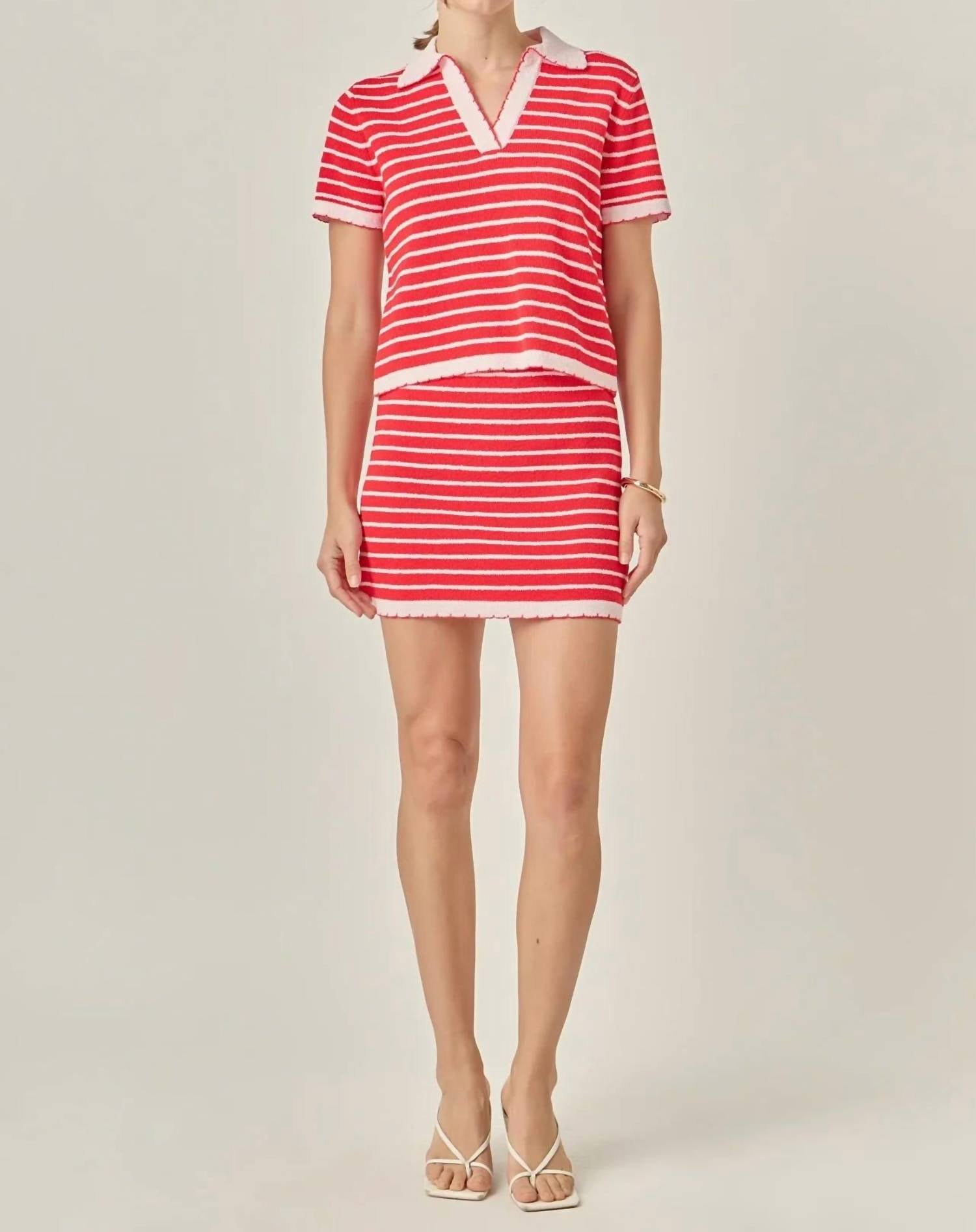 Introducing the Lila Scallop Knit Skirt by English Factory, a striking mini skirt in vibrant red designed for chic summer outings. Crafted from a comfortable blend of 60% acrylic and 40% polyester, this skirt showcases bold stripes and a playful scalloped hemline. Its easy pull-on design with an elastic waist ensures a flattering fit. Care instructions include hand wash and lay flat to dry, making it a perfect addition to your vacation wardrobe.