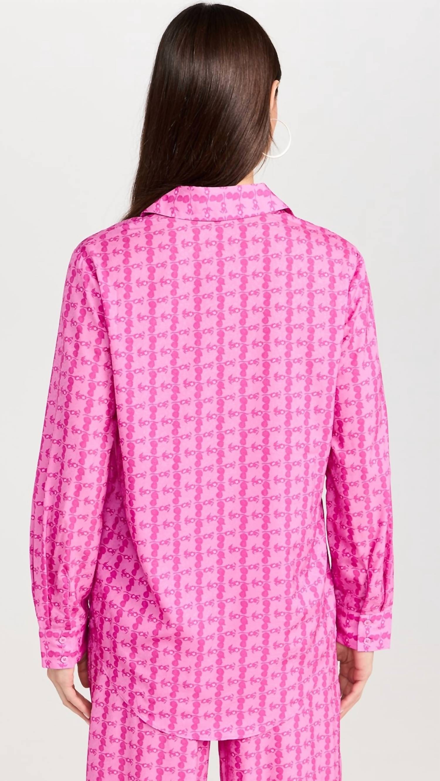 A classic button down shirt that will never go out of style. Upgrade your wardrobe with the English Factory Printed Satin Shirt in a vibrant pink pattern. Designed with long sleeves and button cuffs, this collared shirt is a chic addition to any outfit. Crafted from 100% polyester, its 26-inch length offers a sophisticated silhouette. Imported from China, it features a button closure and requires hand washing to maintain its stunning satin finish.