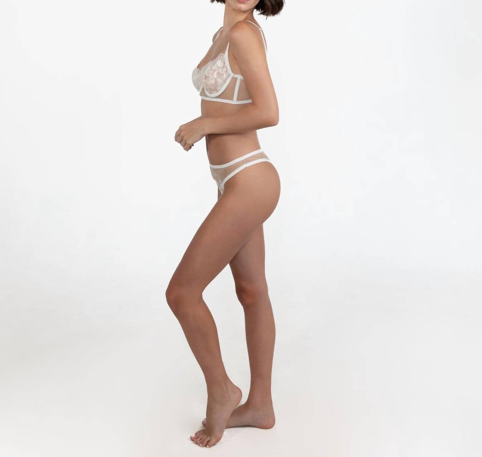 This bra will be your new top-drawer favorite. Indulge in elegance with the Entos Odette Bra, a beautifully crafted bralette designed for those special days. Made from soft and luxurious lace with sophisticated velvet applications, this bra offers both comfort and style. Ideal for anniversaries and Valentine's Day, it comes in a stunning white color. Care instructions recommend hand washing for longevity. Note: Designed with a smaller fit, consider buying a size up.
