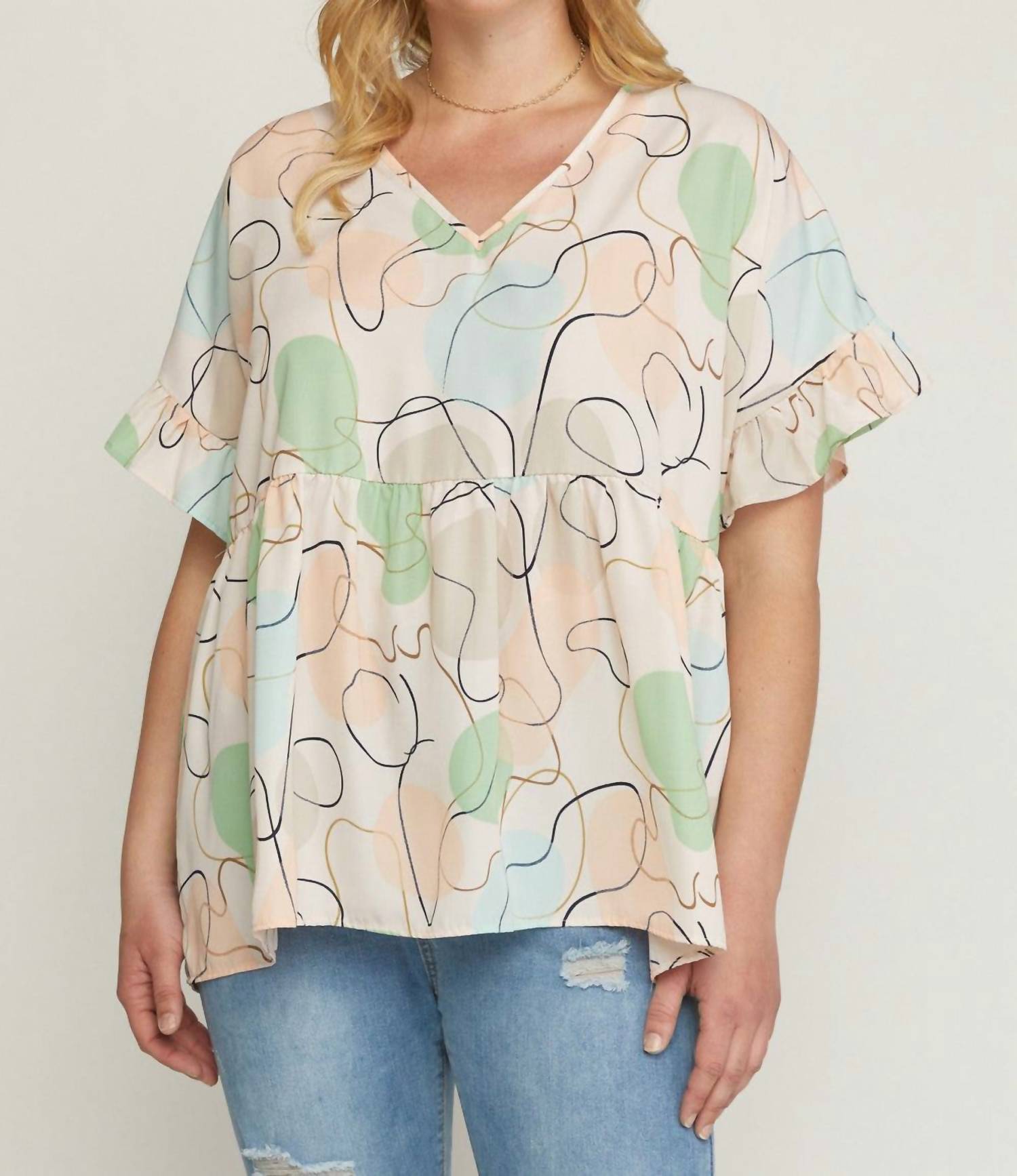 Pair this with your favorite jeans and slides for your next girls night out. Embrace effortless style with the Abstract Peplum Top by Entro, a must-have in your wardrobe. Featuring short, ruffled sleeves and a comfortable pull-on closure, this top boasts a chic V-neckline and a flattering peplum design. Made from lightweight 100% polyester with an oversized silhouette, it's perfect for stylish comfort. Country of Origin: USA. Care: Hand wash or dry clean. Available measurements: Small Bust 42", Length 25"; Medium Bust 44", Length 25"; Large Bust 46", Length 25"; XL Bust 54", Length 30"; 1X Bust 56", Length 30"; 2X Bust 58", Length 30".