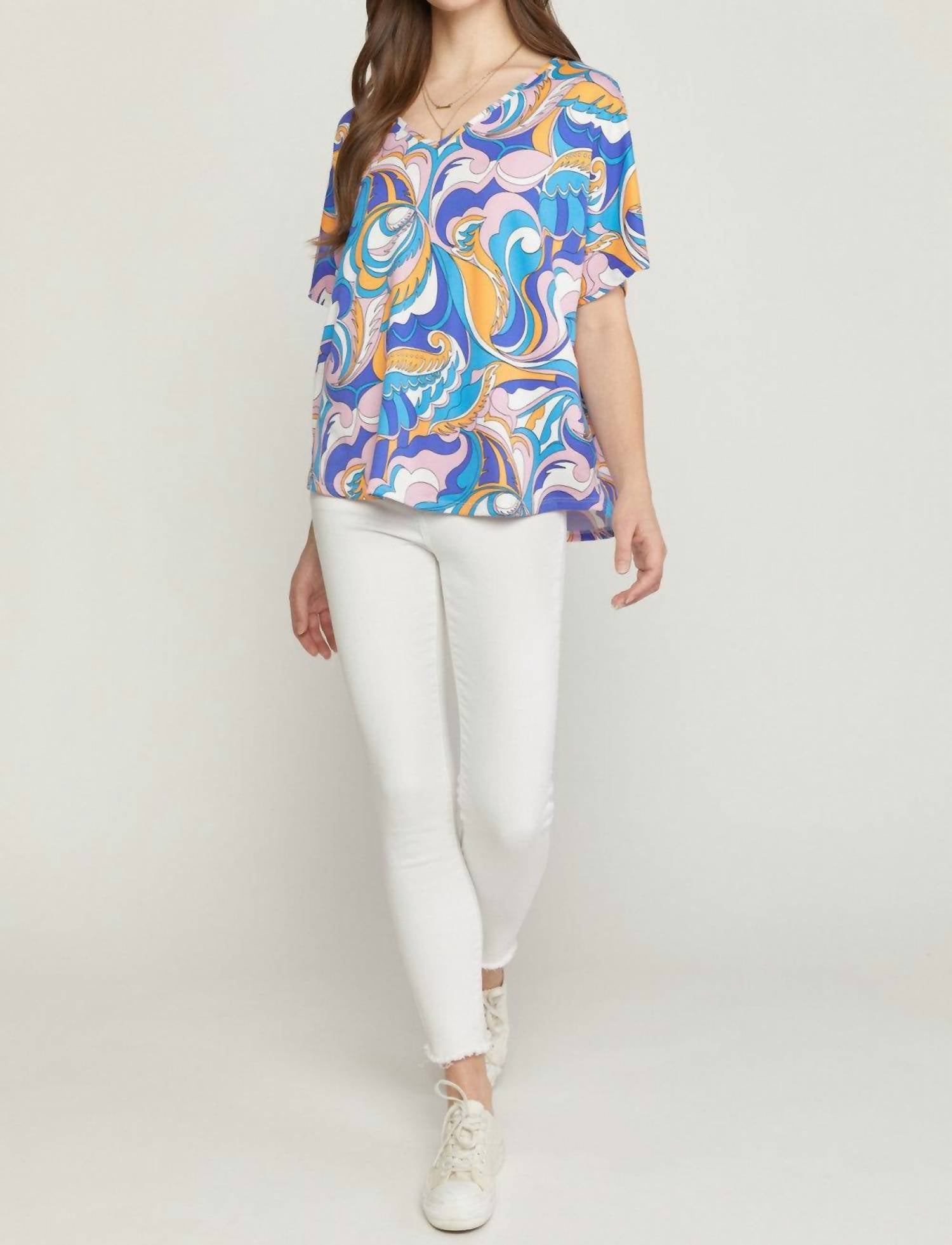 The short sleeve tee you'll want in every color. Short sleeves. V-neckline. Colorful abstract print. Relaxed oversized silhouette. Lightweight. 96% Polyester, 4% Spandex, soft and stretchy fabric. Hand wash or dry clean. Made in the USA.