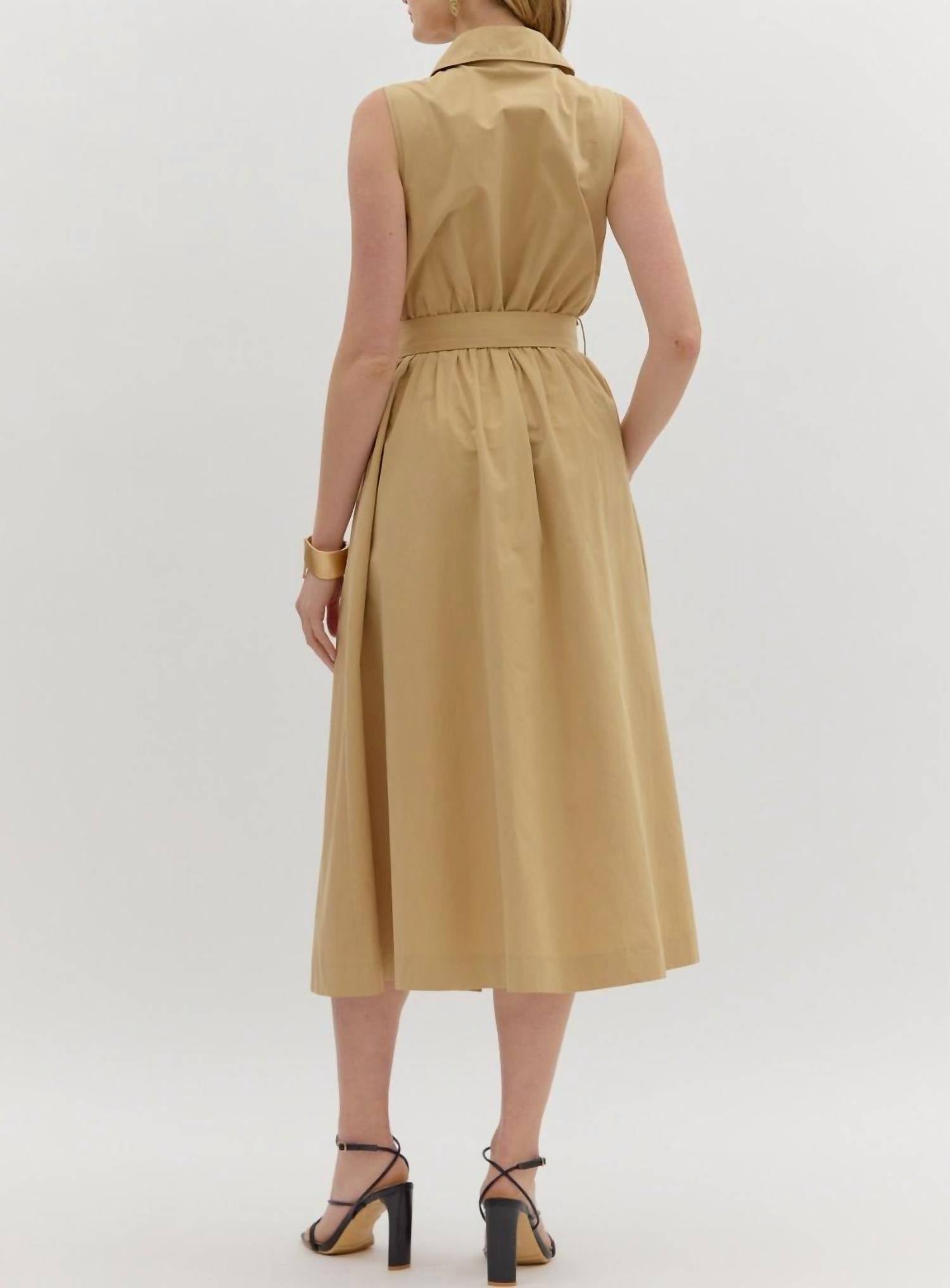 A flattering yet comfortable dress you'll be reaching for season after season. Introducing the Dress Belted With Pleated Skirt & Pockets by Entro, a chic addition to your festive wardrobe in a sophisticated beige hue. This sleeveless, solid-patterned midi dress is crafted from 100% Cotton and showcases a shirt dress silhouette with a collar neckline for a timeless look. A flattering elasticated back waist and removable self-belt provide personalized comfort, while the accent button closure adds a sleek finish. Designed with practical side pockets, this versatile piece offers endless styling possibilities, ideal for spring occasions like a dinner party.