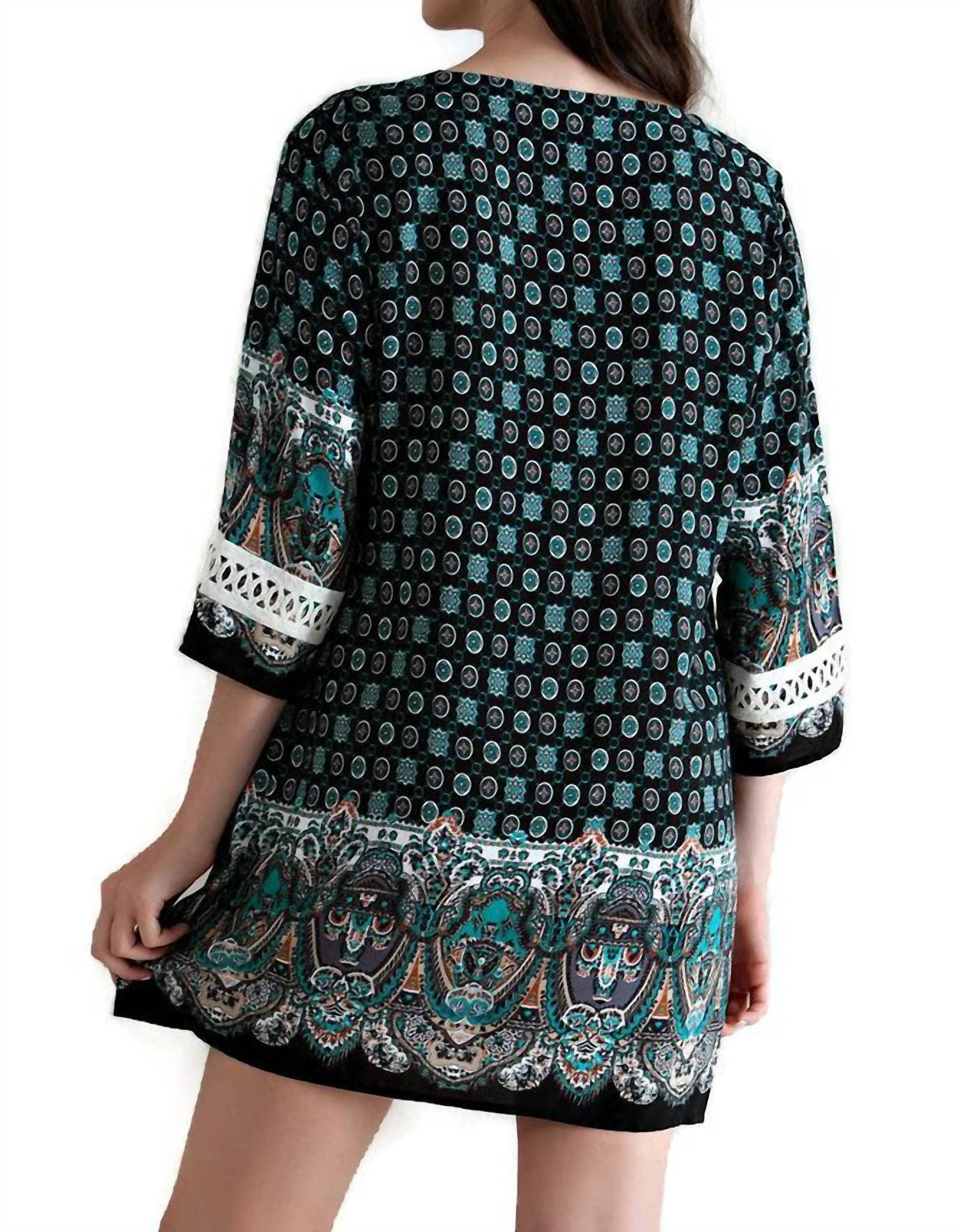 The kind of easy and flattering dress you'll be reaching for all season long. Introducing the Border Print Lace up Tassel Tie Dress by entro, a chic addition to your wardrobe with its eye-catching pattern. This three-quarter sleeve dress is crafted from 100% rayon offering a comfortable feel. Designed with a mini shift silhouette, it features a lace-up V-neckline with tassels and crochet lace detailing. Its pull-on closure makes it easy to wear, and a hand wash keeps it looking its best. Perfect for any occasion where style meets simplicity.