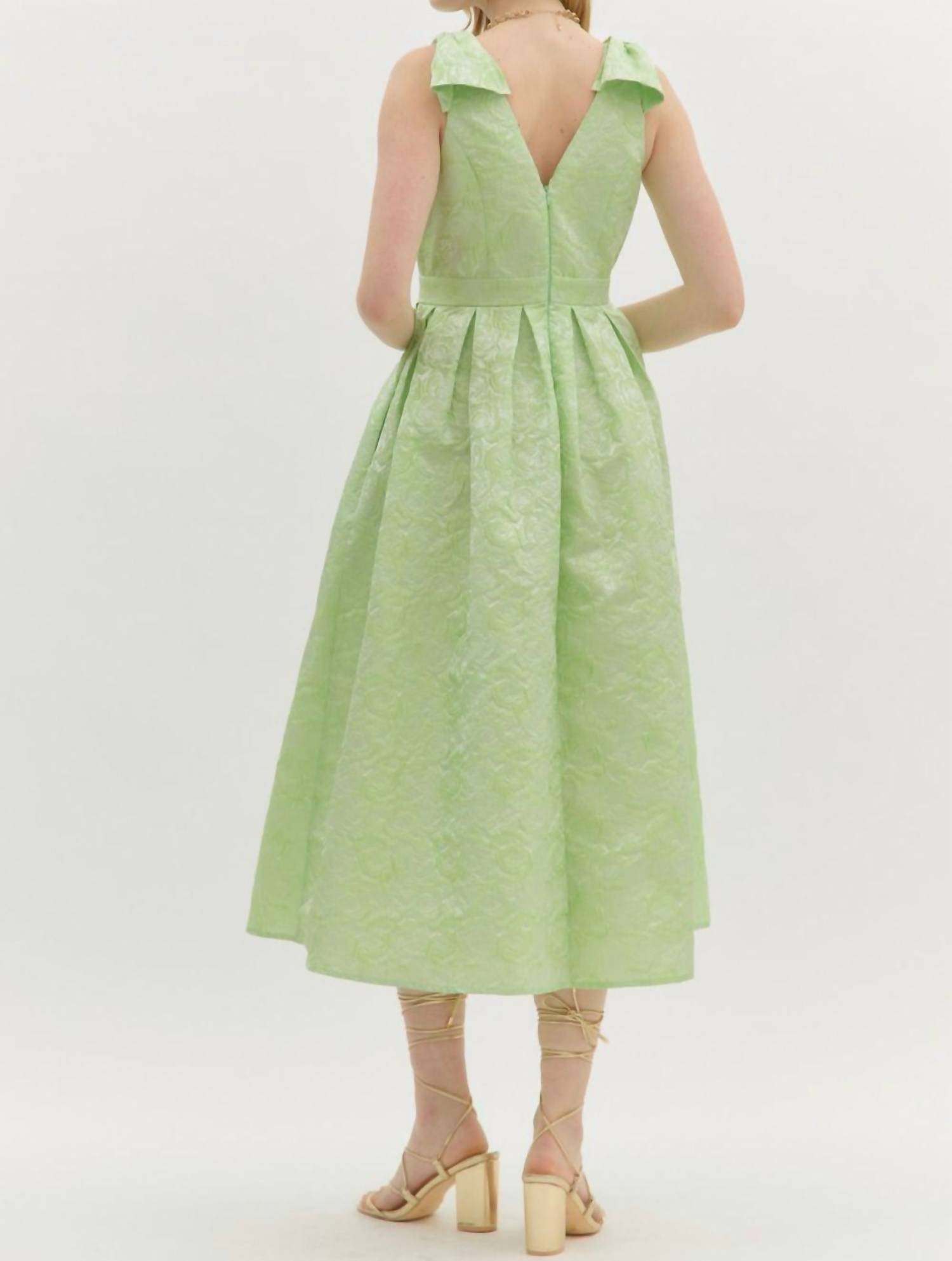 A midi dress so versatile, your options for wearing it are endless. This is a charming and polished midi-length dress, designed to stand out at any special occasion. It is made from a floral textured woven fabric and features a flattering V-neckline. A distinctive and graceful detail is the oversized bow accent at the shoulder. The dress includes a pleated skirt for movement, along with practical side pockets. It is fully lined for comfort and secures with a smooth back zipper closure.