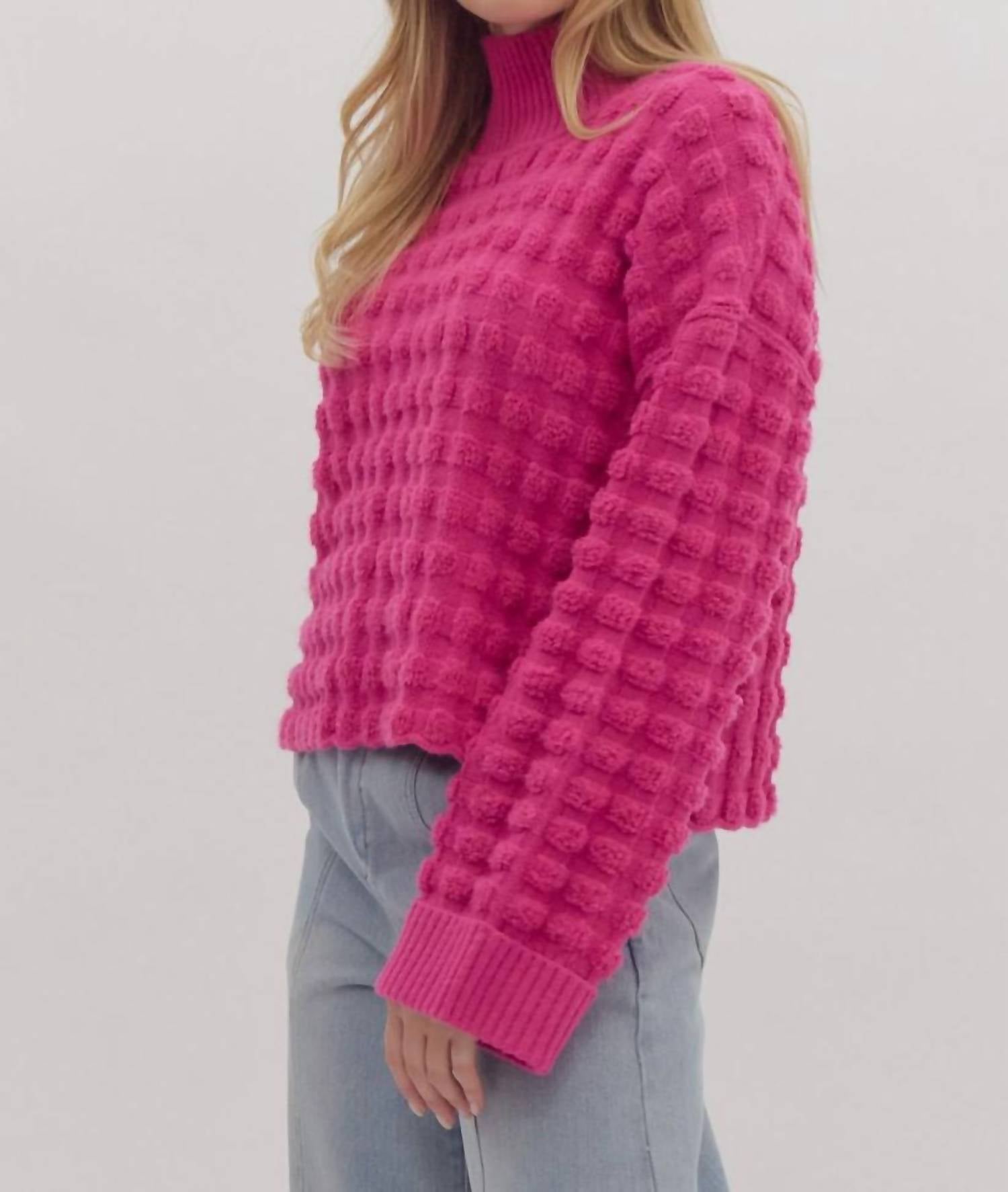 A classic staple that every closet needs. Introducing the Bubble Sweater by Entro, a charming addition to your winter wardrobe in a delightful light blue hue. This piece features long sleeves and a mock neck, perfect for the Thanksgiving or Back to School season. Made of 52% acrylic, 28% nylon, and 20% polyester, this textured sweater offers a unique style while ensuring comfort. Closure: Pull On.