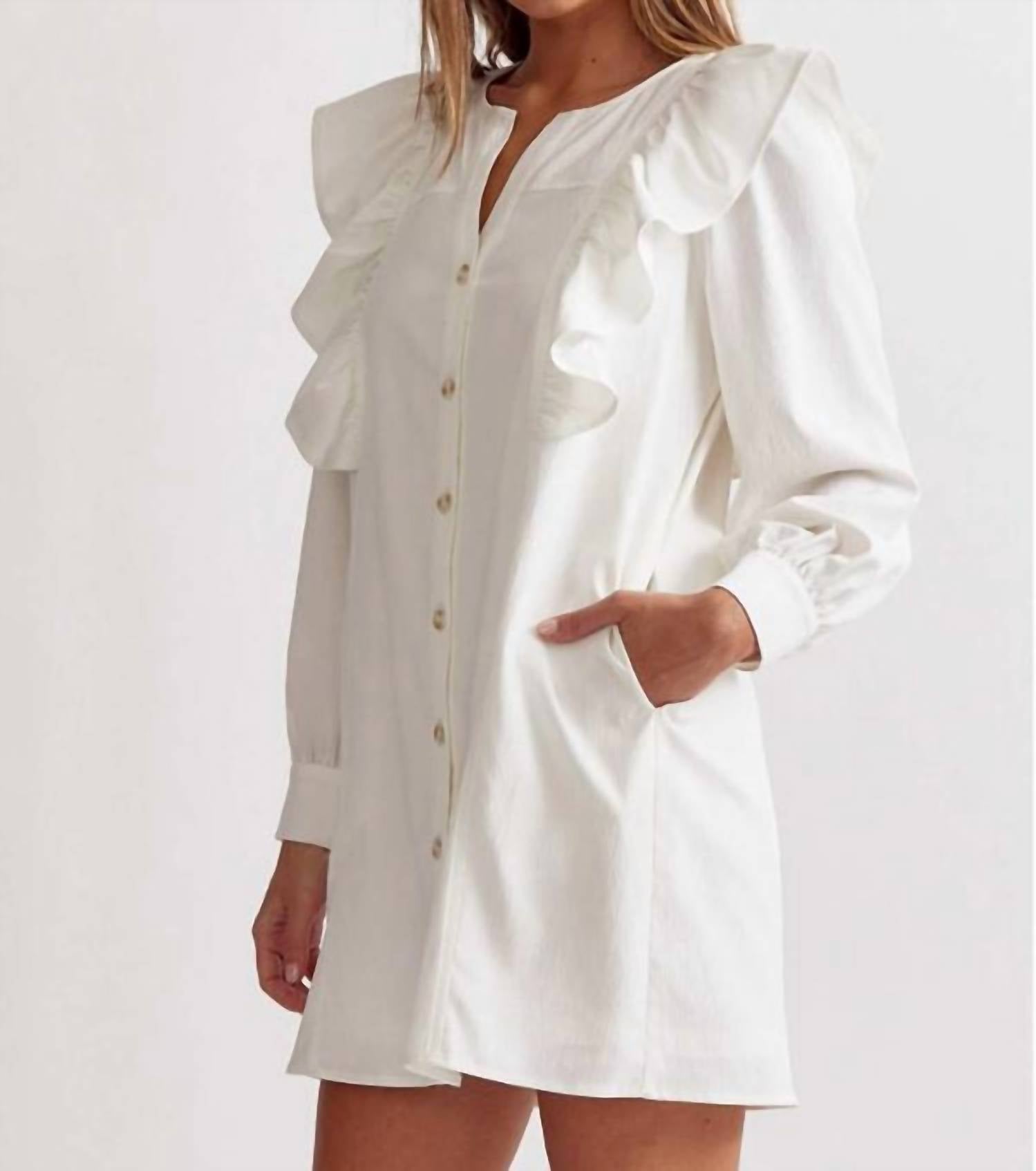 A flattering yet comfortable dress you'll be reaching for season after season.Pristine white long sleeve garment. Blends sophistication with a touch of playful elegance. Features a crewneck and gracefully extends to the wrists. Adorned with charming ruffle detailing. Crafted from high-quality polyester. Designed to fit slightly larger. Simply size down for a more tailored look.