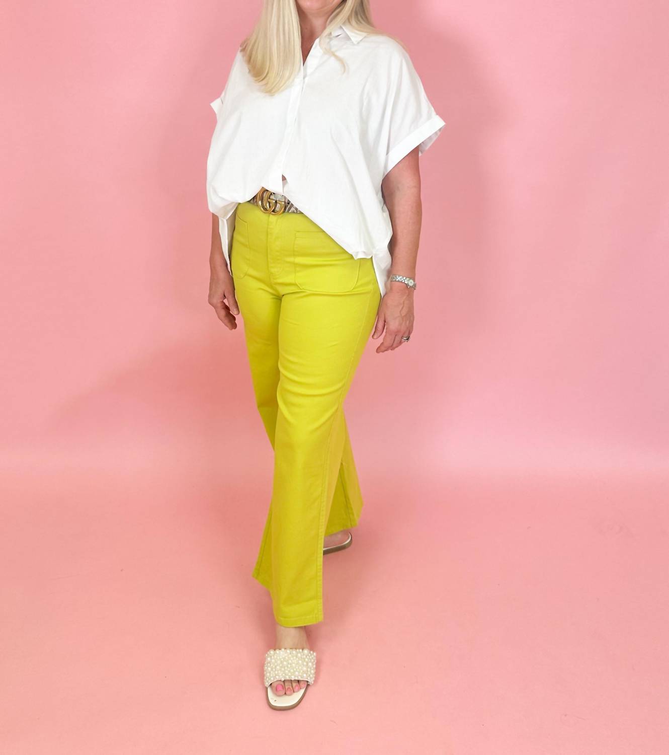 Introducing the Calm Feeling Twill Pant by Entro, a chic addition to your wardrobe in a vibrant Margarita Lime shade. These pants boast a wide leg style and practical patch front pockets, adding both sophistication and functionality to your look. Composed of 97% Cotton and 3% Spandex, they offer a comfortable, relaxed fit perfect for any occasion.