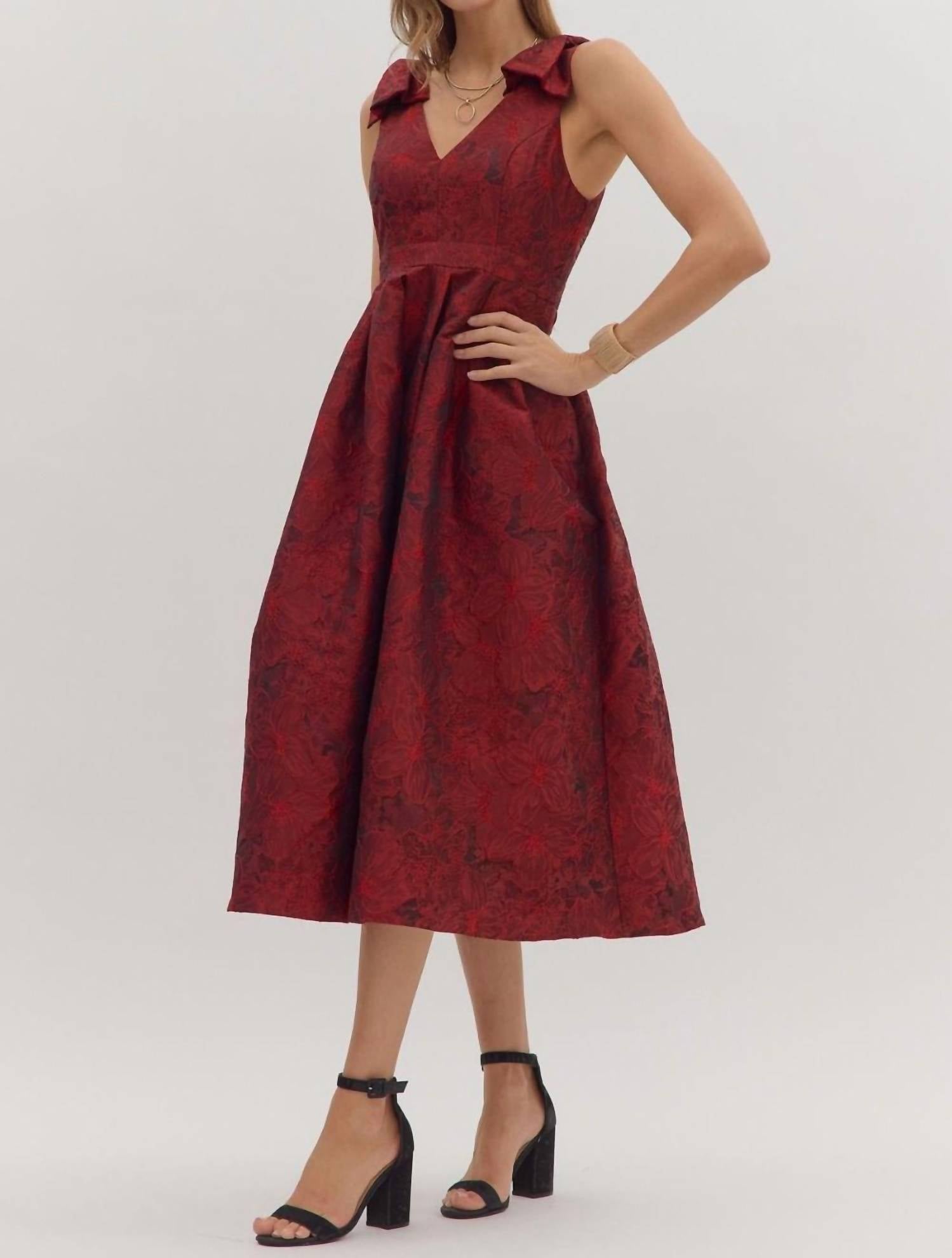 Just add slides or mules and you are good to go. Make a statement at your next event with the Celebration Midi Dress by Entro, an embodiment of quiet luxury in a striking red shade. This sleeveless dress is crafted from 100% polyester and boasts a floral jacquard fabric with chic bow accents on the shoulder straps. Featuring a graceful pleated A-line skirt and convenient side pockets, this design ensures both elegance and practicality. The discreet zip closure at the back provides a seamless fit, making it an excellent choice for spring dinners and Christmas parties alike.