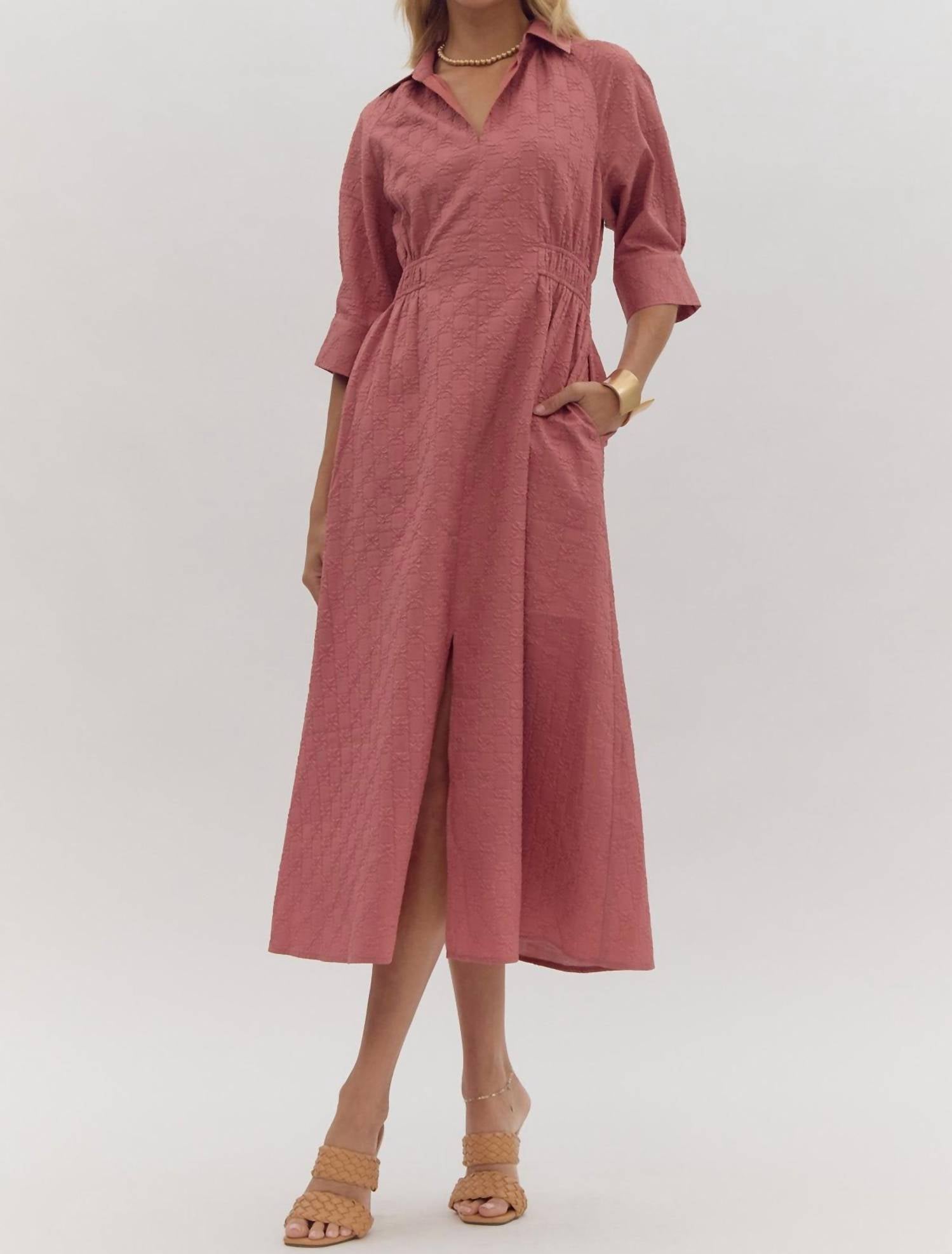 Introducing the Collared Midi Dress by Entro in a beautiful Slate Rose shade. This women's dress features ¾ raglan sleeves with an embossed button closure and a flattering slit v-neck below the collar. Composition: 85% Rayon, 15% Spandex. Closure: Pull on. The dress is designed with side pockets and an elastic waist for added comfort. Woven and non-sheer, this lightweight, lined midi dress is perfect for any occasion.