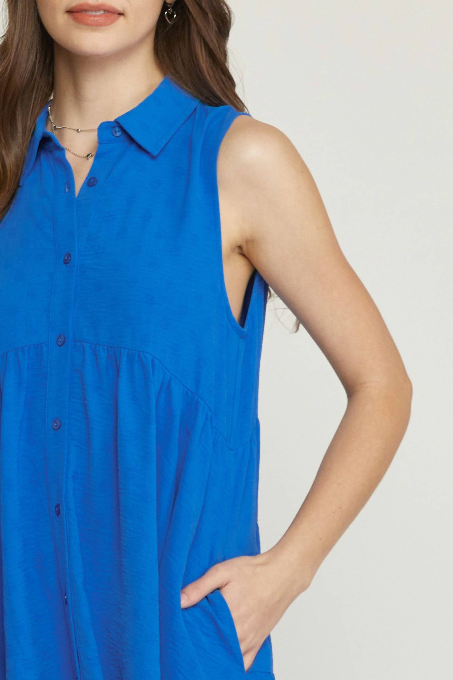 Discover the versatile charm of this tunic blouse, designed with both layering and standalone wear in mind. Its flattering silhouette and stylish details make it a closet essential. Collared neckline. Sleeveless. Button down closure. Hi-low hem. 100% Cotton. Machine wash cold.