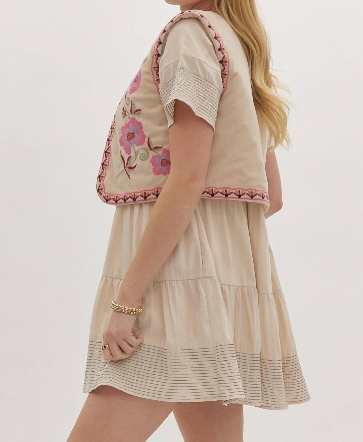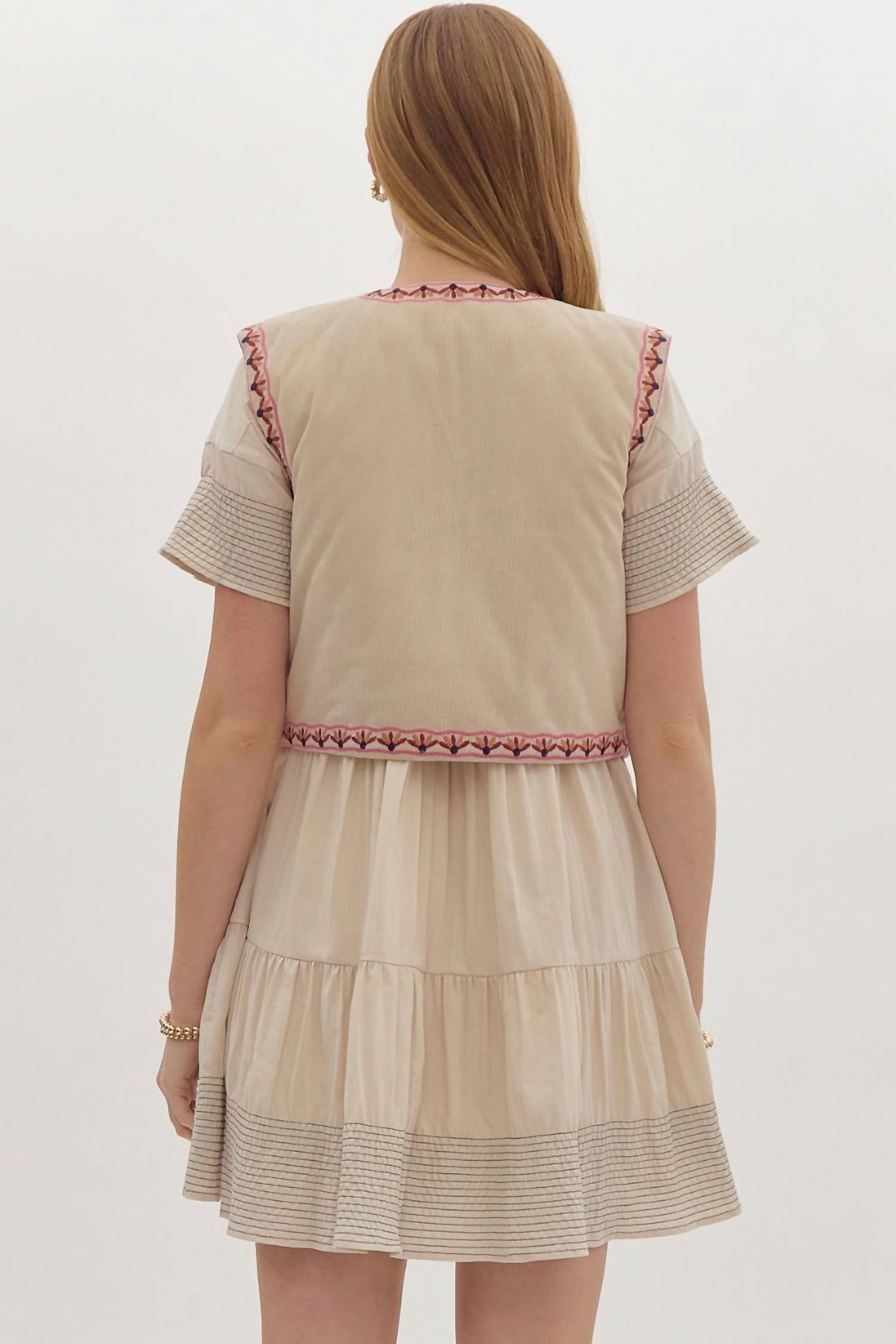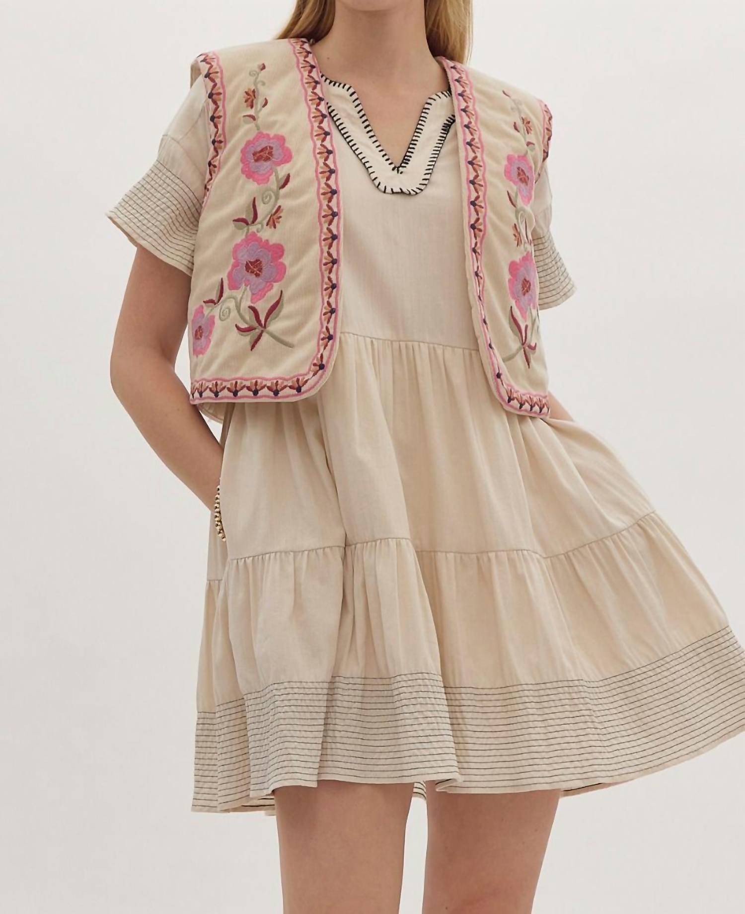 A vest so versatile you can mix and match it with almost any outfit and it will feel brand new every time. Embrace bohemian elegance with the Corduroy Floral Embroidered Vest by Entro, expertly crafted to enhance your style. This sleeveless vest, made from corduroy, boasts intricate floral embroidery and a lightweight, quilted interior that ensures comfort throughout the day. The vest's ecru color offers a versatile addition to any wardrobe.