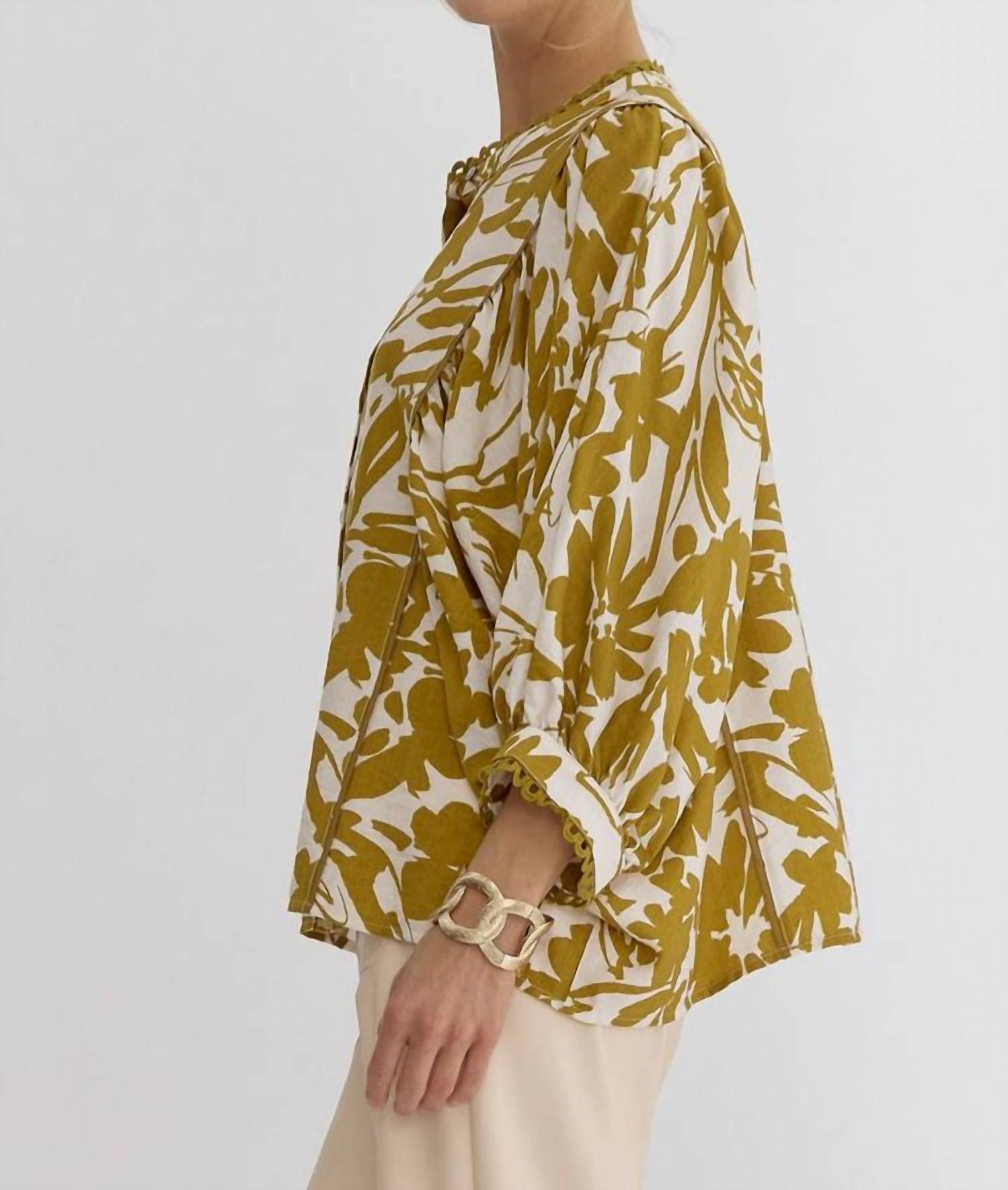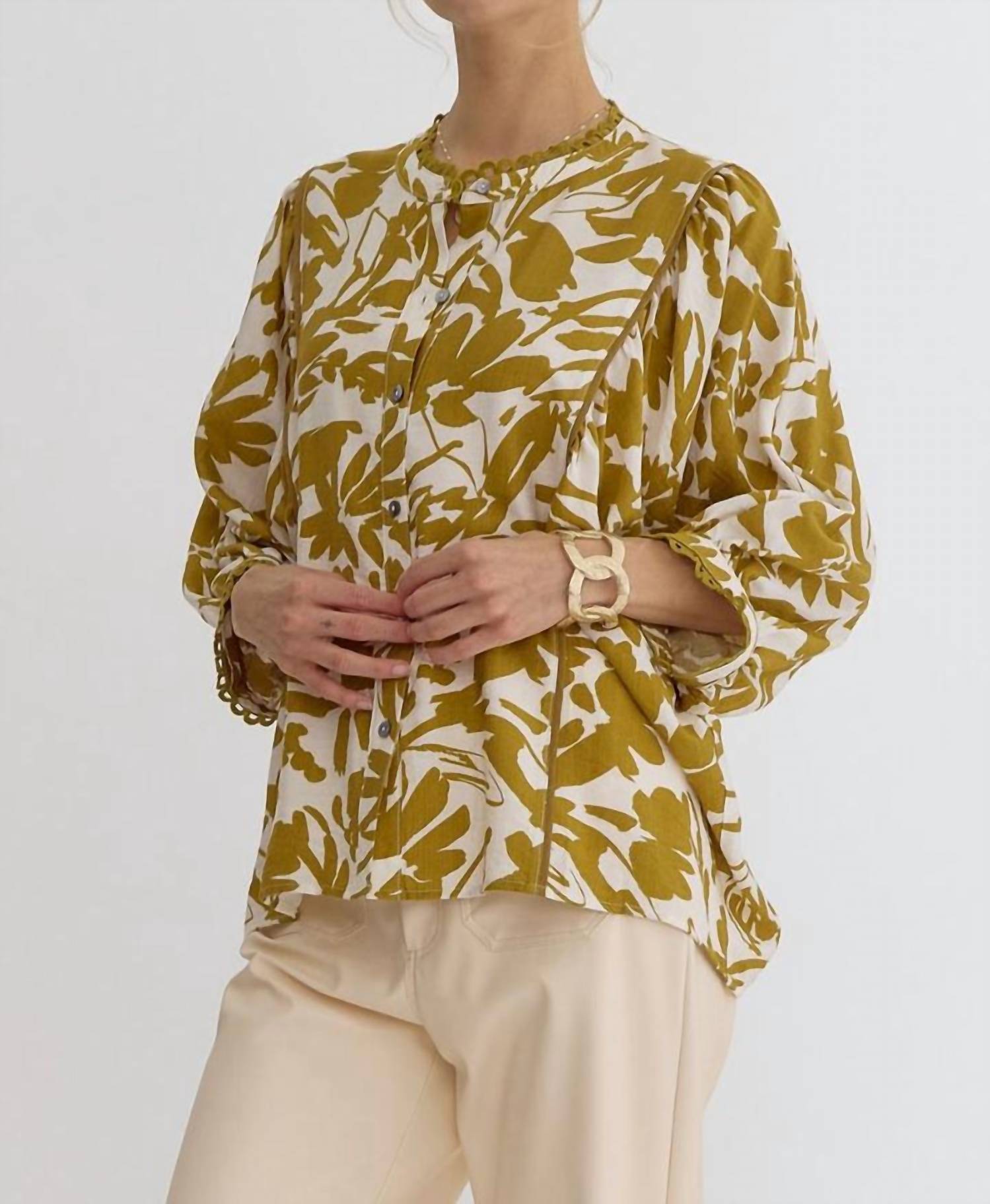 A versatile blouse that works from desk to dinner!This button-down top features a trendy leaf print and delicate lace trim detail. It has dolman 3/4 sleeves and is made from 85% Rayon and 15% Nylon.