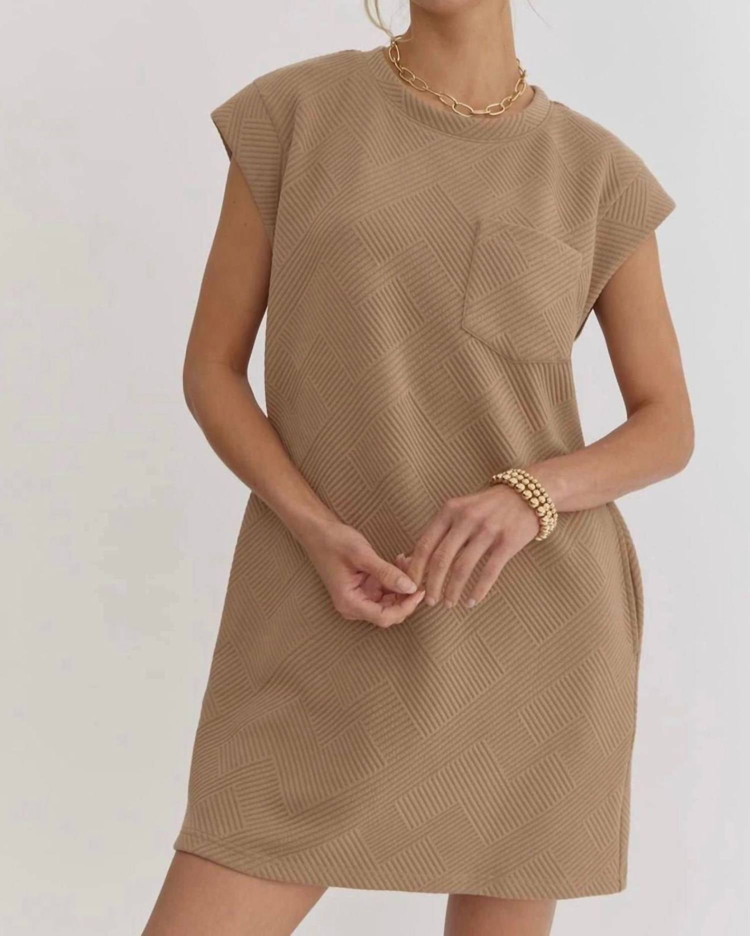 The kind of easy and flattering dress you'll be reaching for all season long. Introducing the Elenor Mini Dress by Entro, a stylish "Throw On and Go" piece in a soft beige hue. This shirt silhouette dress boasts short cap sleeves, a crewneck, and convenient side pockets, making it a versatile addition to your wardrobe. Crafted from 98% Polyester and 2% Spandex, it ensures a comfortable fit. Featuring a pull-on closure, this textured, solid-patterned dress is ideal for casual elegance.