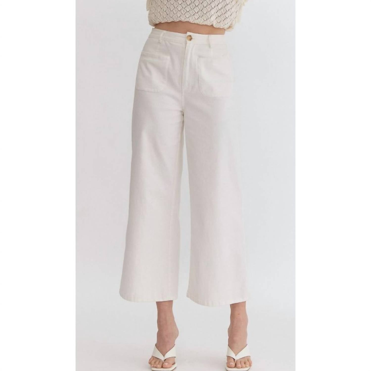 Effortlessly chic redefine casual elegance. Crafted from a blend of 97% cotton and 3% spandex. Offer a soft, stretchy feel in a chic off-white hue. High rise and a 27" inseam provide a flattering fit. Complemented by the relaxed wide-leg style. Featuring front and faux back pockets, a zipper closure and belt loops for practicality. Functional and stylish. For optimal care, hand wash in cold water, avoid bleach and line dry.