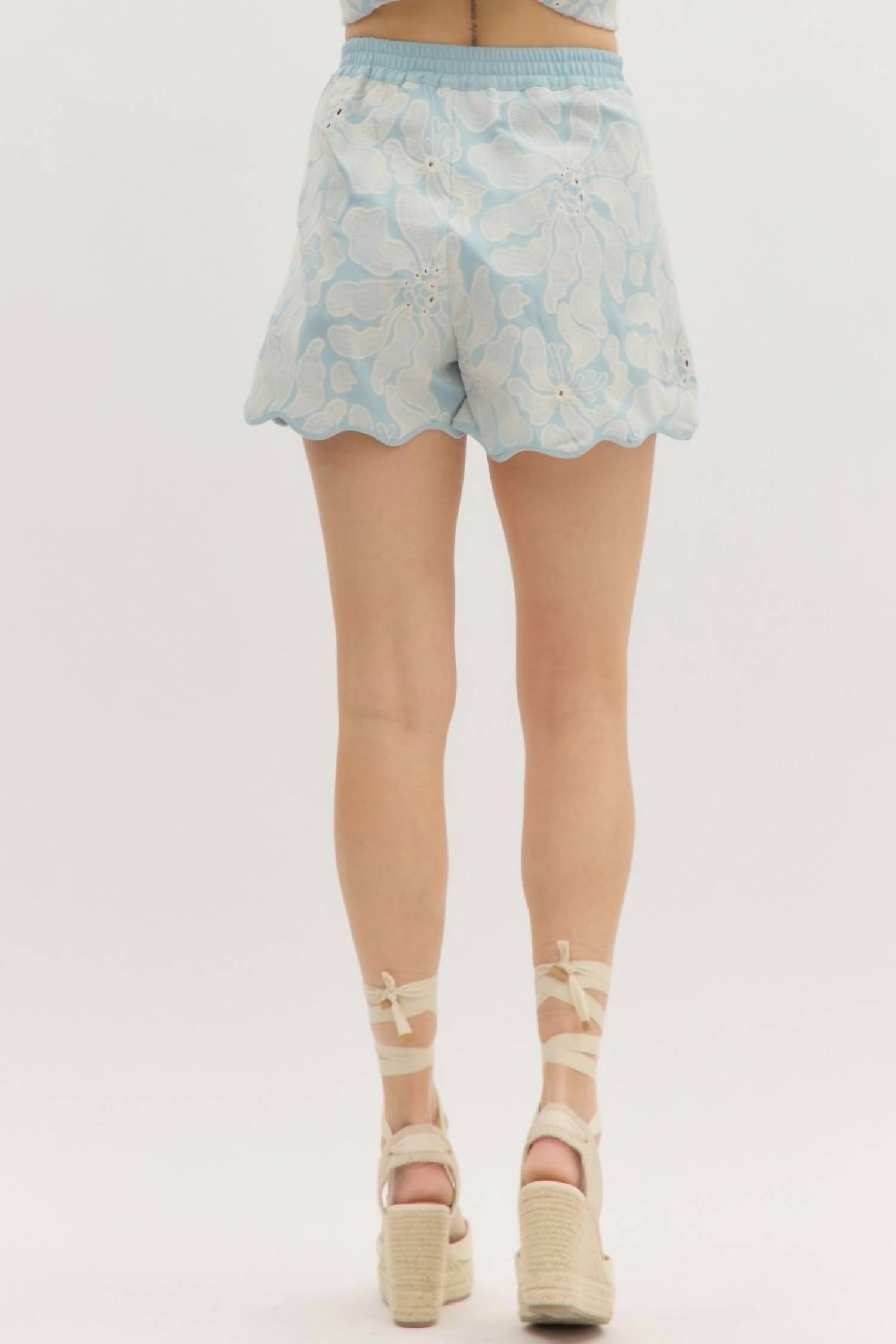 Tuck your favorite tee into these high-waist shorts for a more casual-cool feel. Enhance your summer wardrobe with the Emma Embroidered Summer Short by Entro, in a refreshing Cool Ice Blue. These high-waisted shorts, adorned with elegant floral embroidery and a scalloped hem, offer both style and functionality. Crafted from 100% cotton with side pockets, they feature a hook and eye closure and an elasticated waistband for a comfortable fit. A lined interior adds extra comfort, making these shorts an excellent choice for a boho chic beach day or any festive Thanksgiving occasion.