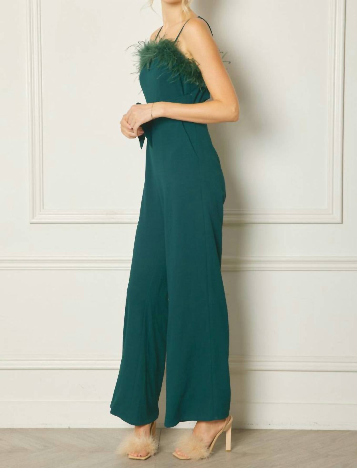A straightleg pant that workes season after season. Dress these up with your favorite blouse or keep it casual with your go-to tee.Green Spaghetti Strap Jumpsuit. Feather Trim Detail At Bust. Self Tie Waist. Open Back Detail. V-Wire Insert At Bust. Invisible Zipper At Back. Pockets At Side. Jumpsuit Is Lined. Woven. Non-Sheer And Lightweight. 100% Polyester.