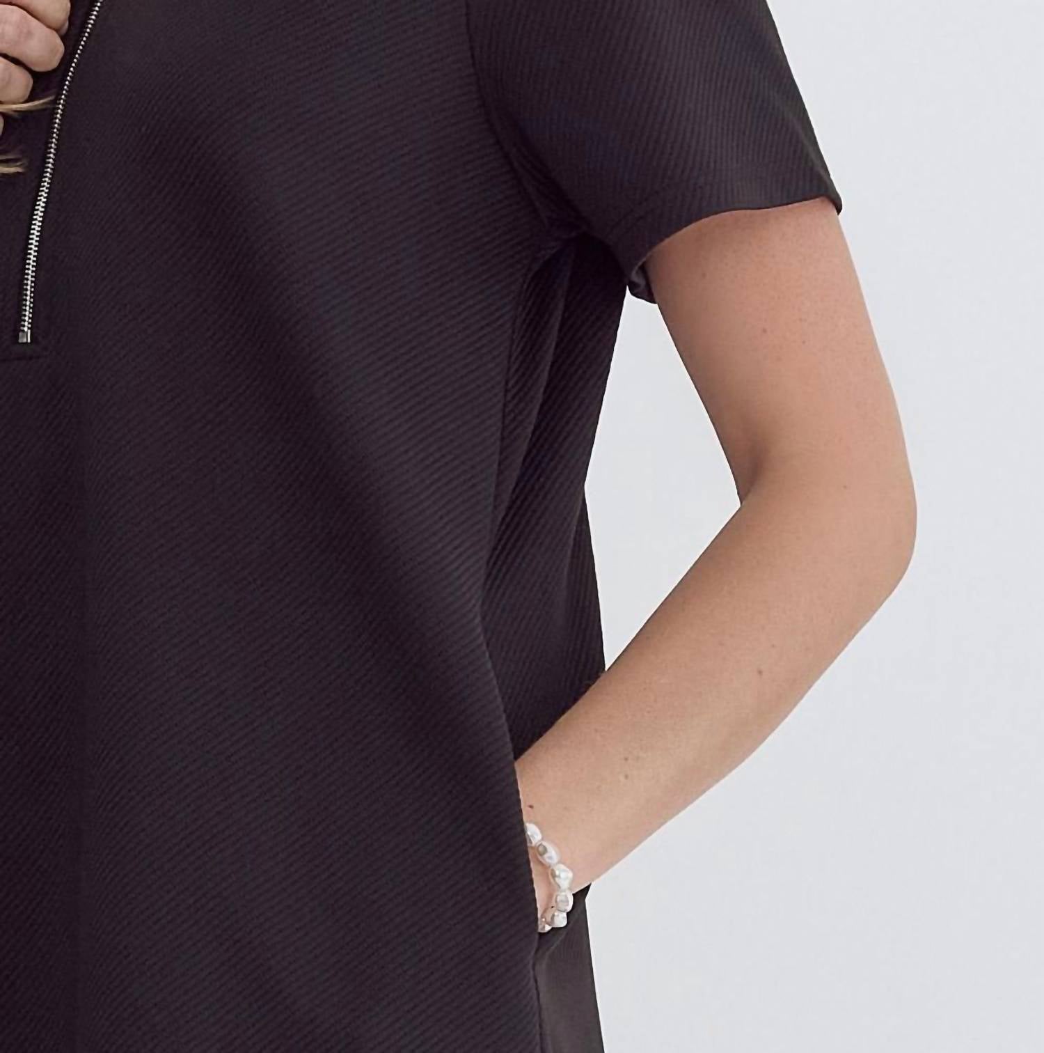 A short and breezy dress for those warmer days. Step out in confidence with the Feeling Like a Boss Textured Dress by Entro, a chic addition in classic black. This mini dress features short sleeves and a stylish V-neckline, complete with a front zipper closure for easy wear. Crafted from 100% polyester, it ensures a lightweight and non-sheer fit, perfect for day-to-night transitions. Designed with side pockets for added convenience, it blends modern style with practicality.