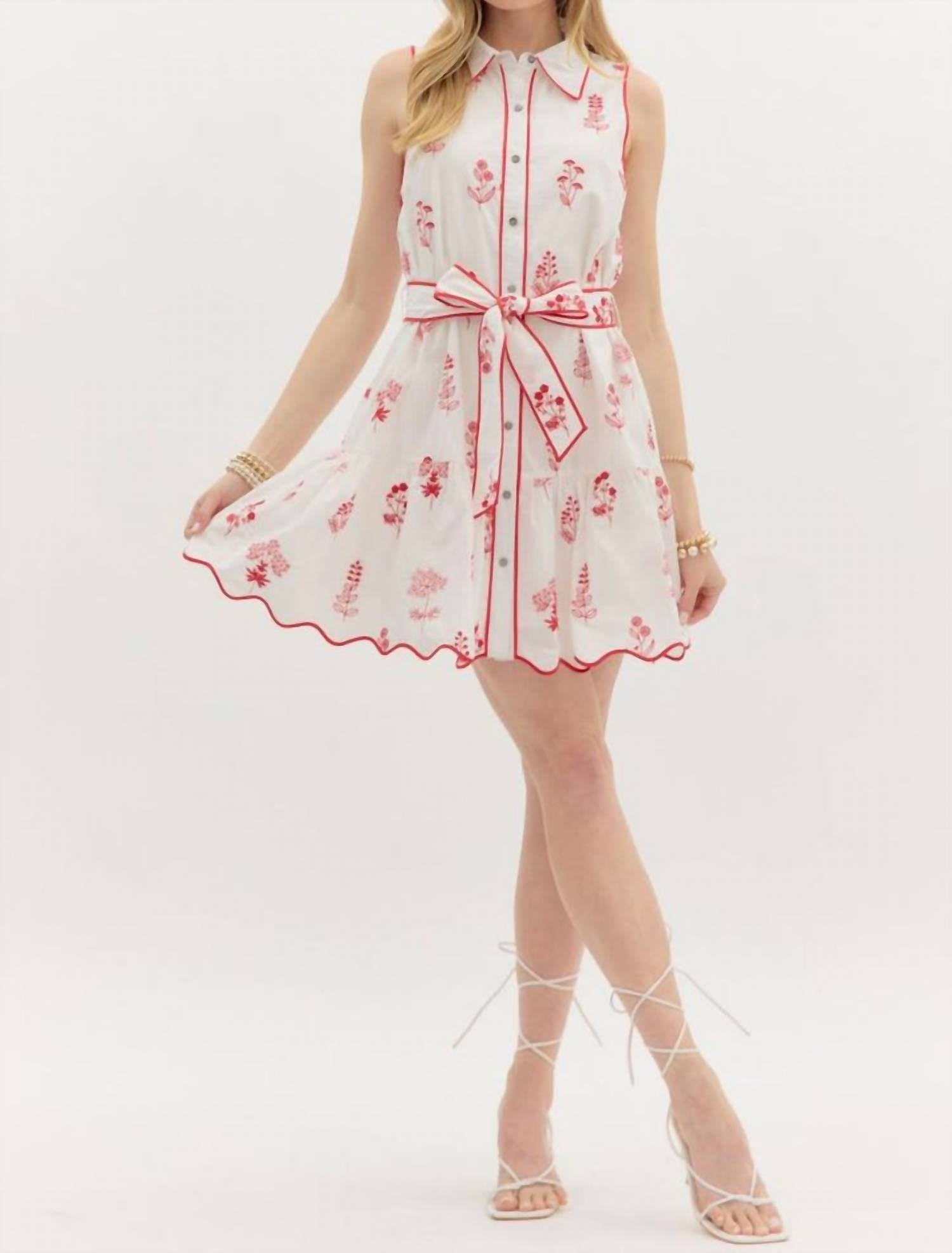 The kind of easy and flattering dress you'll be reaching for all season long. Unveil effortless style with the Flora Scallop Hem Mini Dress by Entro in vibrant red. This sleeveless mini dress, crafted from 100% cotton, showcases a charming floral pattern with intricate embroidery and contrast piping. It features a collared button front, a scalloped hem, and a removable waist belt for a flattering silhouette, along with side pockets for added convenience. Care for this boho chic piece with machine wash and tumble dry. The model, standing at 5'10", wears a size small, Style #D27090.