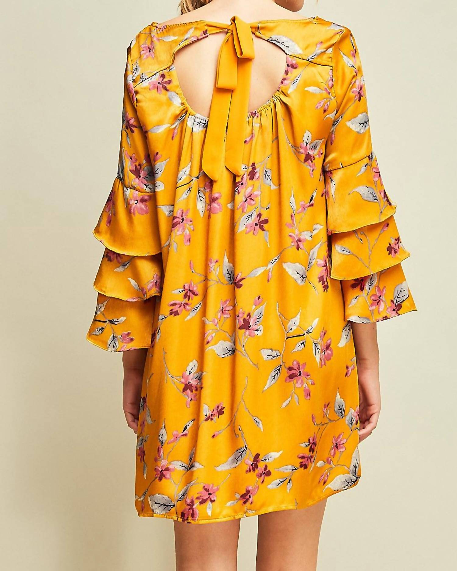 A short and breezy dress for those warmer days. Introducing the Floral and Ruffle Sleeve Dress by Entro, a playful addition to your wardrobe perfect for a beach day. This mini dress features long 3/4 ruffled sleeves and a charming V-neckline. Crafted from 100% polyester, it includes an elasticized cutout back with a tie closure for a flirty touch. Originating from overseas, this dress is fully lined, lightweight, and best cared for by hand washing cold. Available in a vibrant multi-color pattern, the dress comes in sizes with a consistent length of 38 inches, with bust measurements varying from 38" in small to 42" in large.