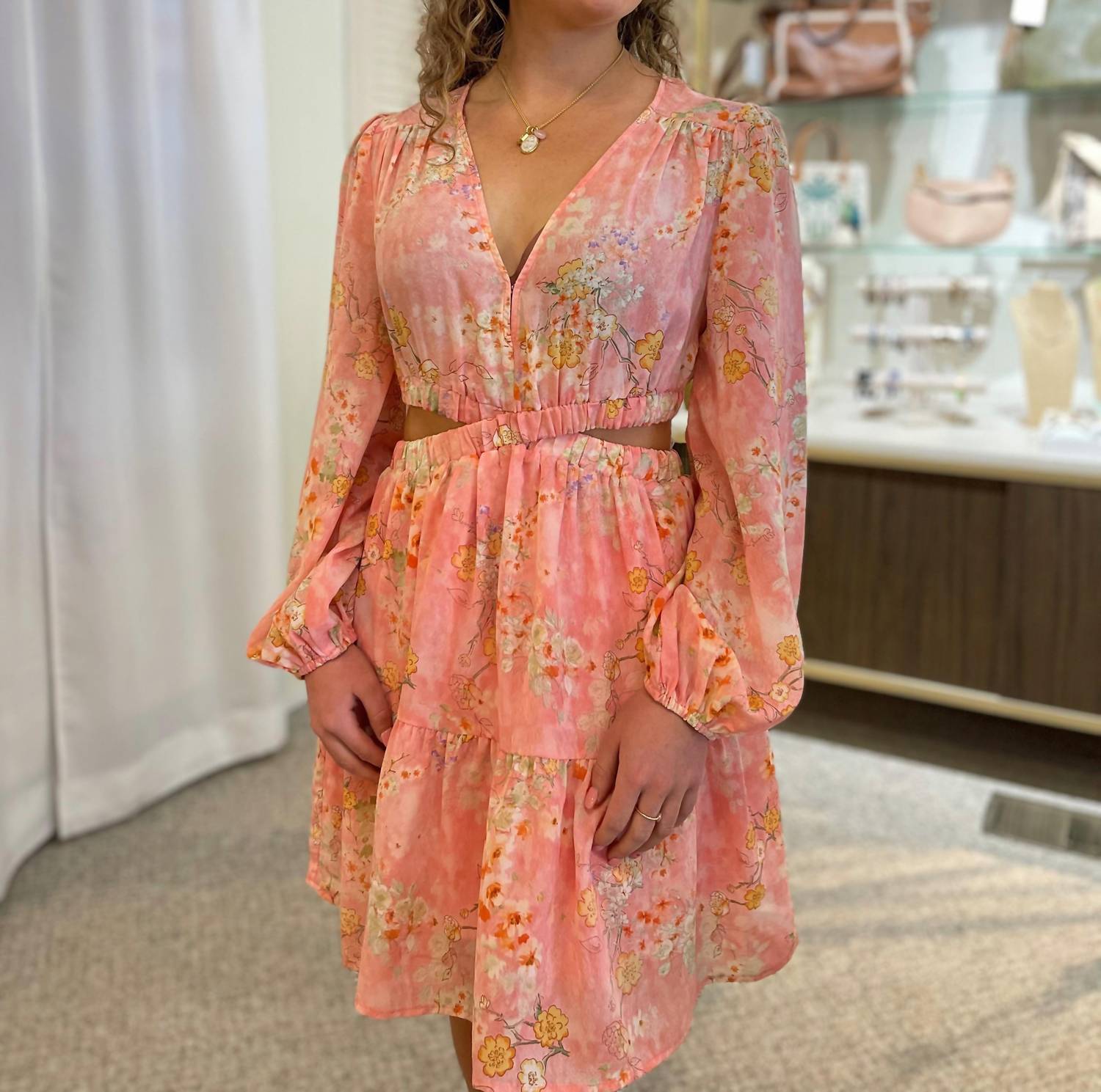The kind of easy and flattering dress you'll be reaching for all season long.Floral print v-neck long sleeve tiered mini dress featuring cutouts at side and back. Hook and eye closure at bust. Lined. Woven. Non-sheer. Lightweight.
