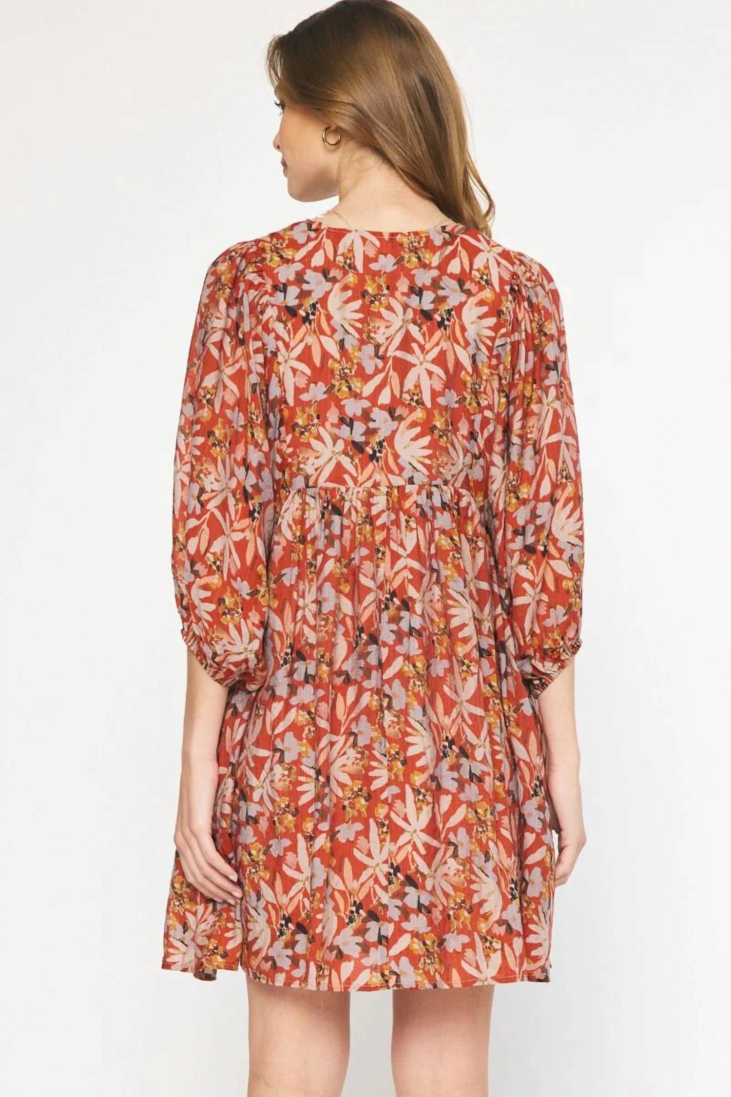 The perfect mini dress for those warmer months. Elevate your summer wardrobe with the Entro Floral Print Mini Dress in vibrant rust, ideal for vacation-ready style. This Boho Chic piece features flowy three-quarter sleeves with elastic cuffs and a flattering V-neckline accented by a self-tie detail. Crafted from a blend of 75% Rayon and 25% Nylon with 100% Rayon contrast fabric, this dress highlights an empire waist and a shift silhouette for an airy, loose fit. Made in China, it includes side pockets for added convenience and requires hand washing and line drying.