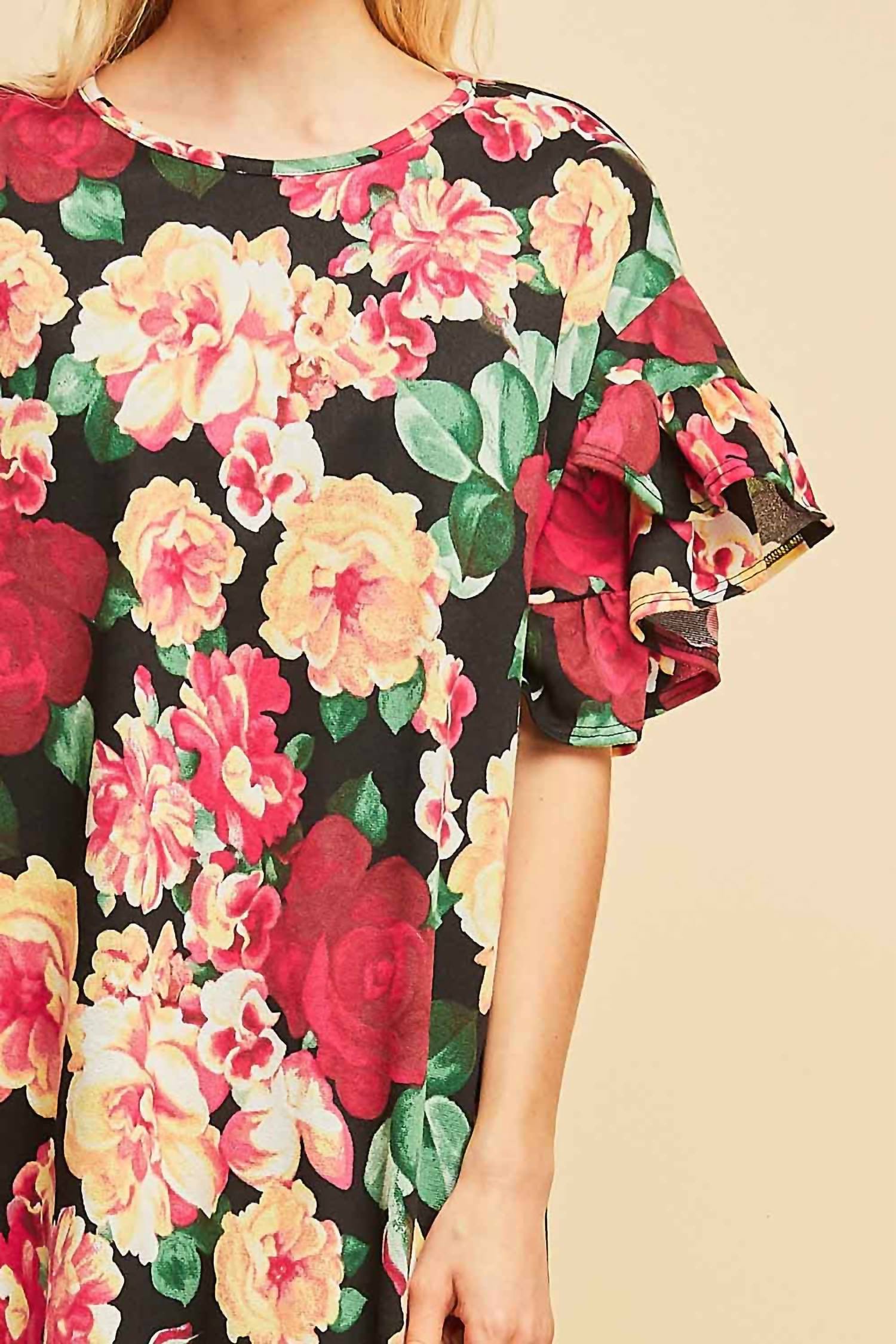 Step out in effortless style with the Floral Ruffle Sleeve Mini Dress by Entro, a bohemian-chic piece in a playful floral pattern. Featuring short ruffled sleeves and dropped shoulders, this knit dress offers a flattering mini silhouette with a cozy crewneck. Crafted from 96% Polyester and 4% Spandex, this imported design is easy to slip on. Care for this summer staple involves a simple hand wash in cold water. It has a bust measurement of 40" and length of 33" for size Small. Model is 5'9" and wears a size Small.