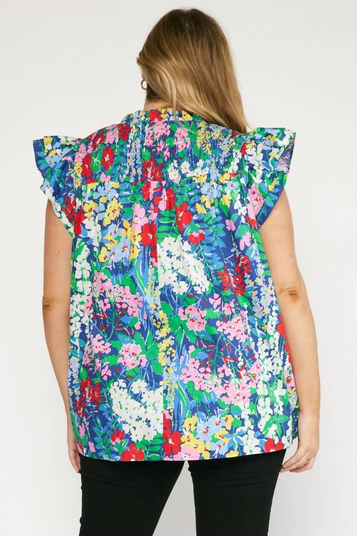 A versatile blouse that works from desk to dinner! The Floral Ruffle Sleeve Top by Entro in Navy is a standout piece for any fashion-forward wardrobe. With cap sleeves, this blouse is made from 100% Cotton, promising both comfort and style in a classic A-line silhouette. Featuring a romantic floral print, smocking detailing, and an effortless pull-on closure, it's designed for a flattering oversized fit. Care instructions recommend hand wash or dry clean for longevity. Available in plus sizes: XL (Bust 48", Length 30"), 1X (Bust 50", Length 30"), 2X (Bust 52", Length 30").