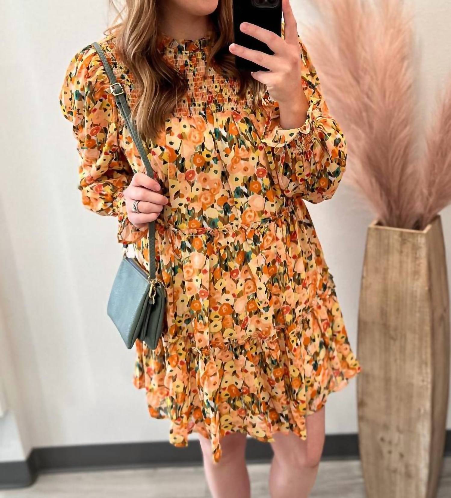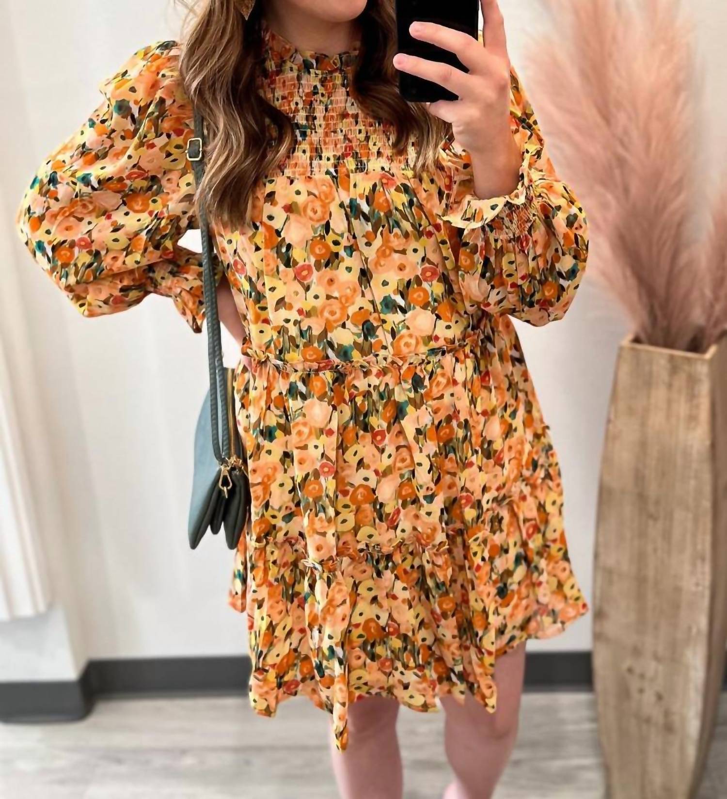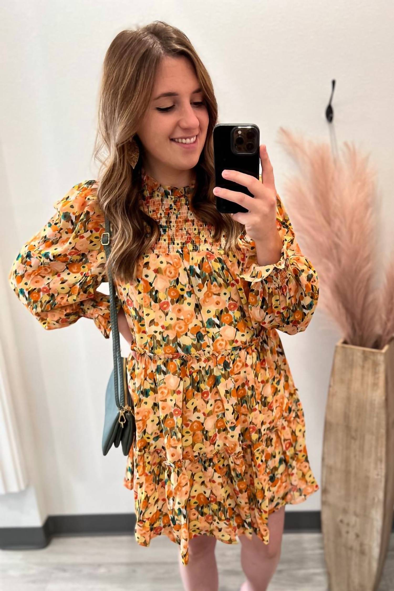 The kind of easy and flattering dress you'll be reaching for all season long.True to size with a roomy fit. If you're between sizes or would like a less roomy fit, you can go with the smaller size. Light weight material. Lined. Flowy fit. Smocking on chest and sleeve cuff. No stretch except for where smocking is. 100% Polyester. Measurement: Small: Bust: 38", Waist: 44", Hips: 64", Length: 23"; Medium: Bust: 40", Waist: 46", Hips: 66", Length: 23"; Large: Bust: 42", Waist: 48", Hips: 68", Length: 23". Length measurement is taken from armpit to hem. Measurements are taken flat without stretch.