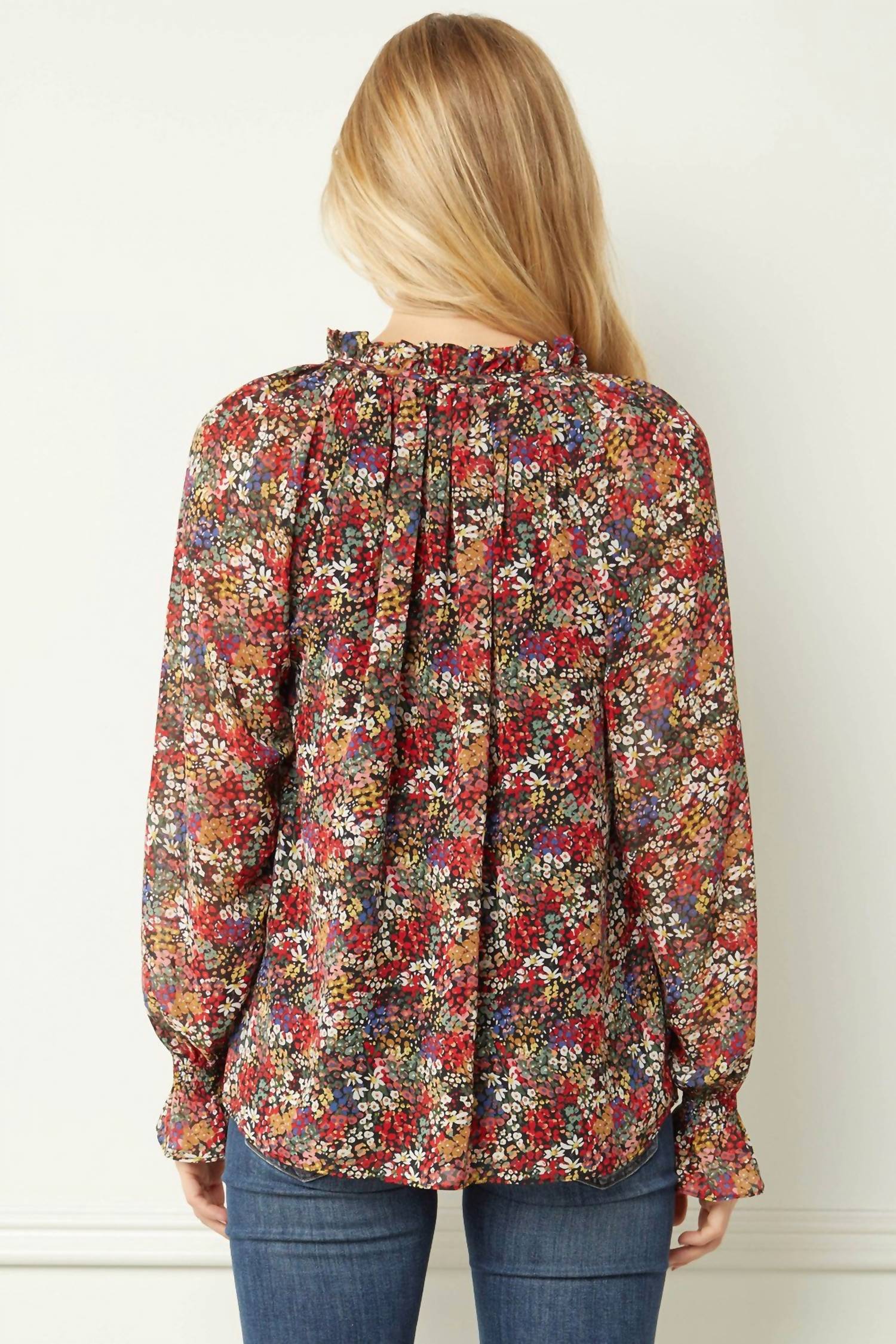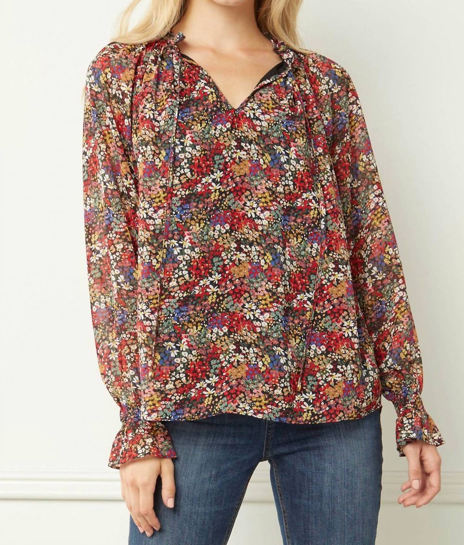 Pair this with your favorite jeans and slides for your next girls night out. Elevate your wardrobe with the Floral V-neck Top by Entro, designed in a boho chic black floral print. This blouse features long semi-sheer sleeves, a V-neckline with a self-tie closure, and a ruffle detail at the neckline for added flair. Crafted from 100% polyester, it offers a flattering a-line silhouette and is lined for added comfort. Sizing varies from a bust of 38" to 50" and length options of 25" or 30". Care instructions recommend hand washing or dry cleaning for best results.