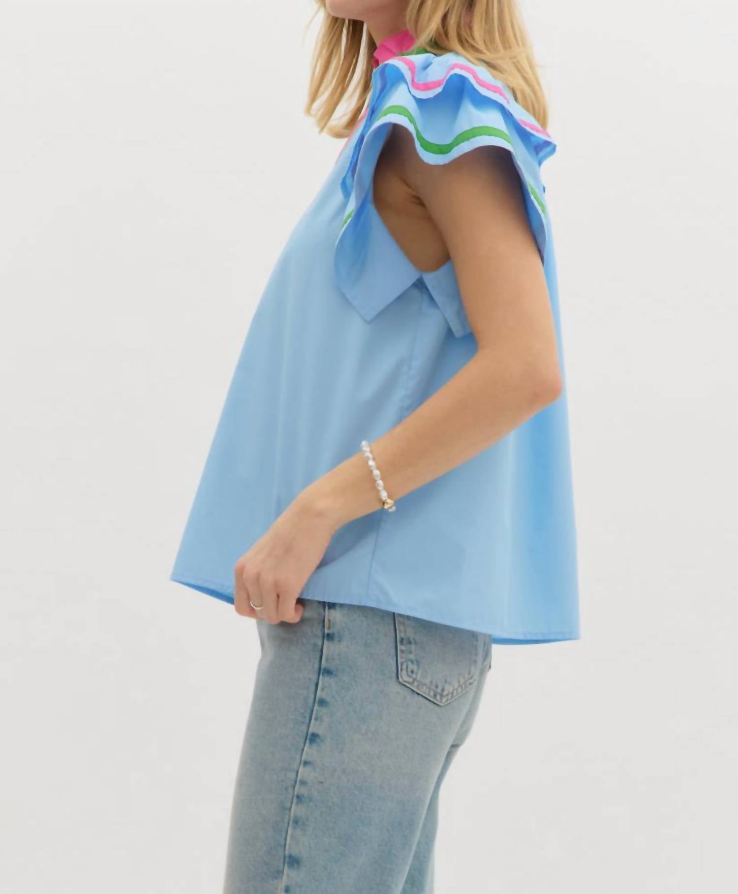 Elevate your style with the Flutter Sleeve V-Neck Top by Entro, showcasing playful multicolor accents that adorn the neck and cap sleeves. Crafted from a lightweight cotton blend, this non-sheer knit is perfect for versatile summer wear. With a pull-on closure for ease and convenience, it runs true to size. Composition: 65% Polyester, 35% Cotton. Care: Machine wash and tumble dry.