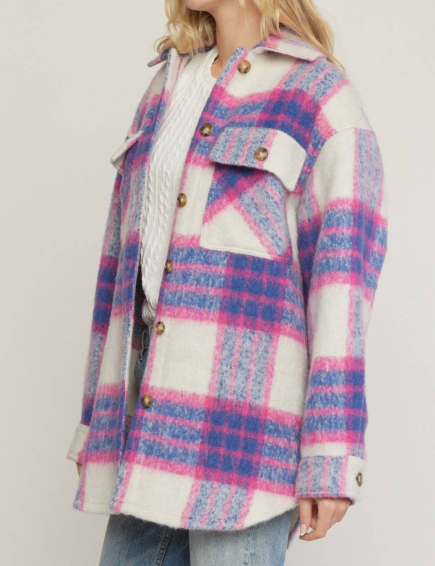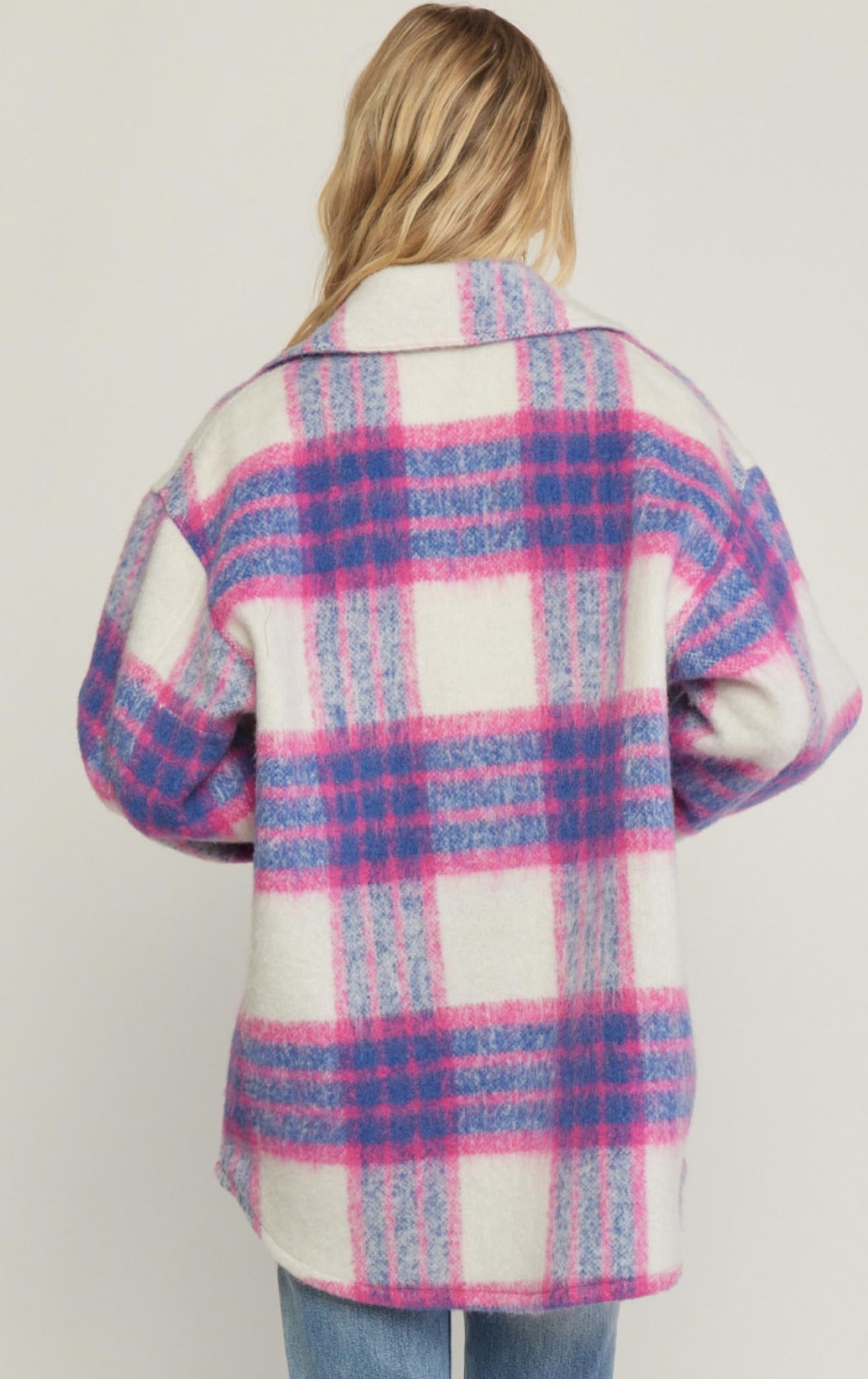 Perfectly tailored and soft to the touch. Discover the Fuzzy Plaid Jacket by Entro, a cozy addition to your wardrobe in charming pink and blue plaid. Offering long sleeves and an oversized fit, this medium-weight jacket is crafted from 100% polyester. It features both side and front pockets, combining functionality with style. The button-up center front with additional button closures at the sleeves completes this versatile piece.