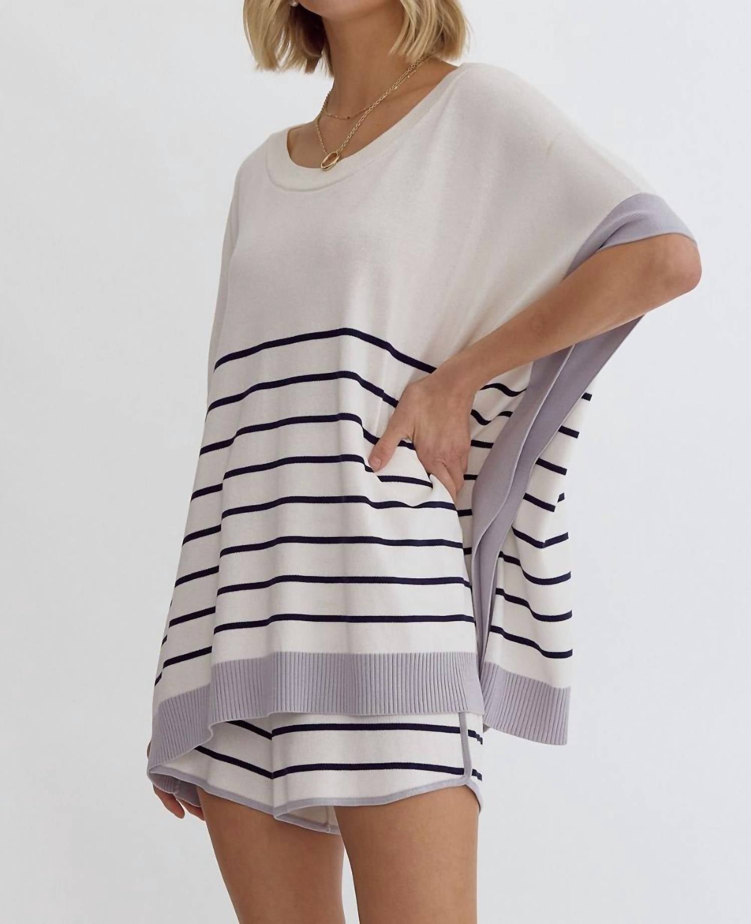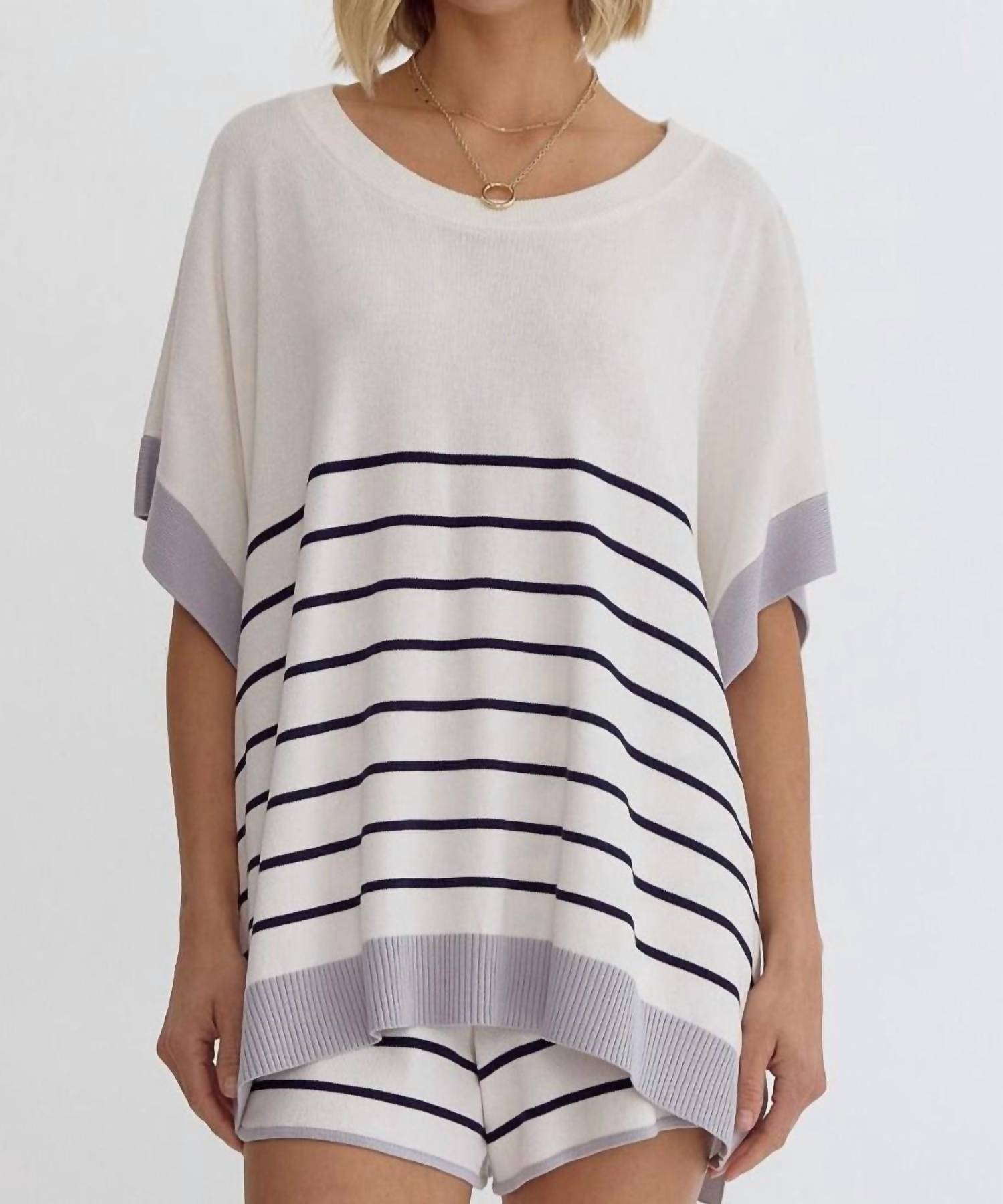 The short sleeve tee you'll want in every color. This oversized poncho features crisp stripes for a fresh feel. It has a solid round neck, stripe details, and is unlined. Made from 90% viscose and 10% spandex, the top is lightweight, knit, and non-sheer. Hand wash cold, line dry.