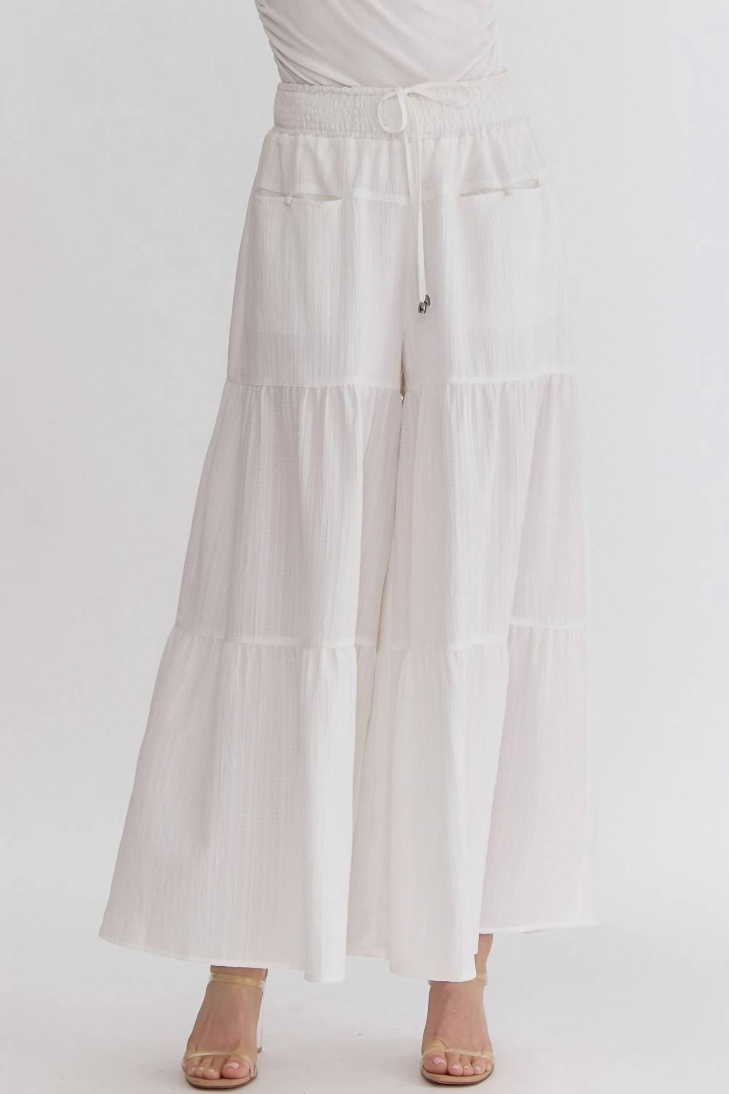 Solid textured high-waisted tiered pants. Smocked waist. Self-tie closure at waist. Pockets at side. Lined with shorts. Woven. Semi-sheer. Lightweight.