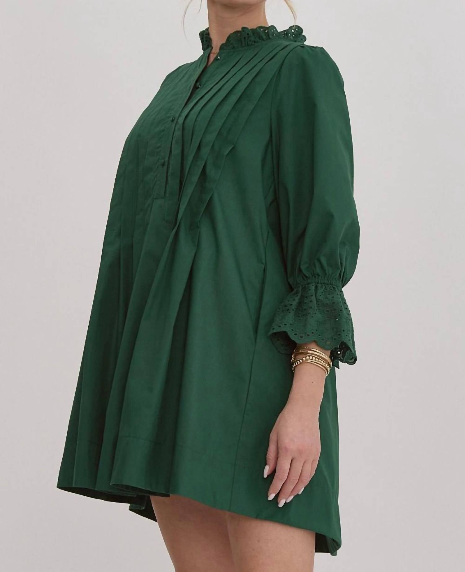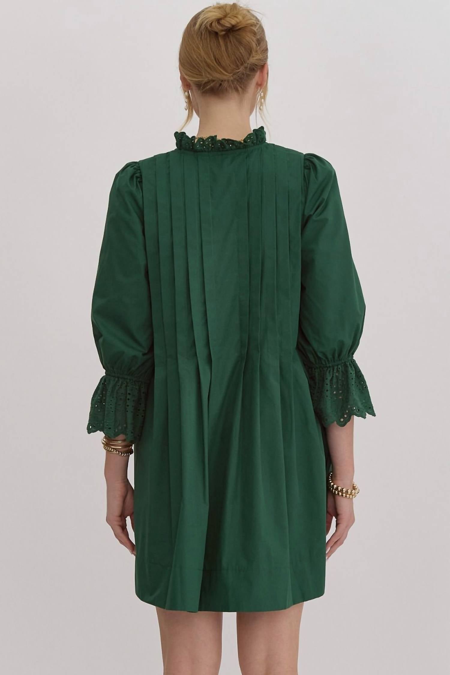 A short and breezy dress for those warmer days. This pleated mini dress features a solid round neck, 3/4 sleeves with eyelet detailing at the cuff and neckline, and a button closure at the front. It has elastic cuffs and convenient pockets at the sides. Lined, made from 100% cotton.