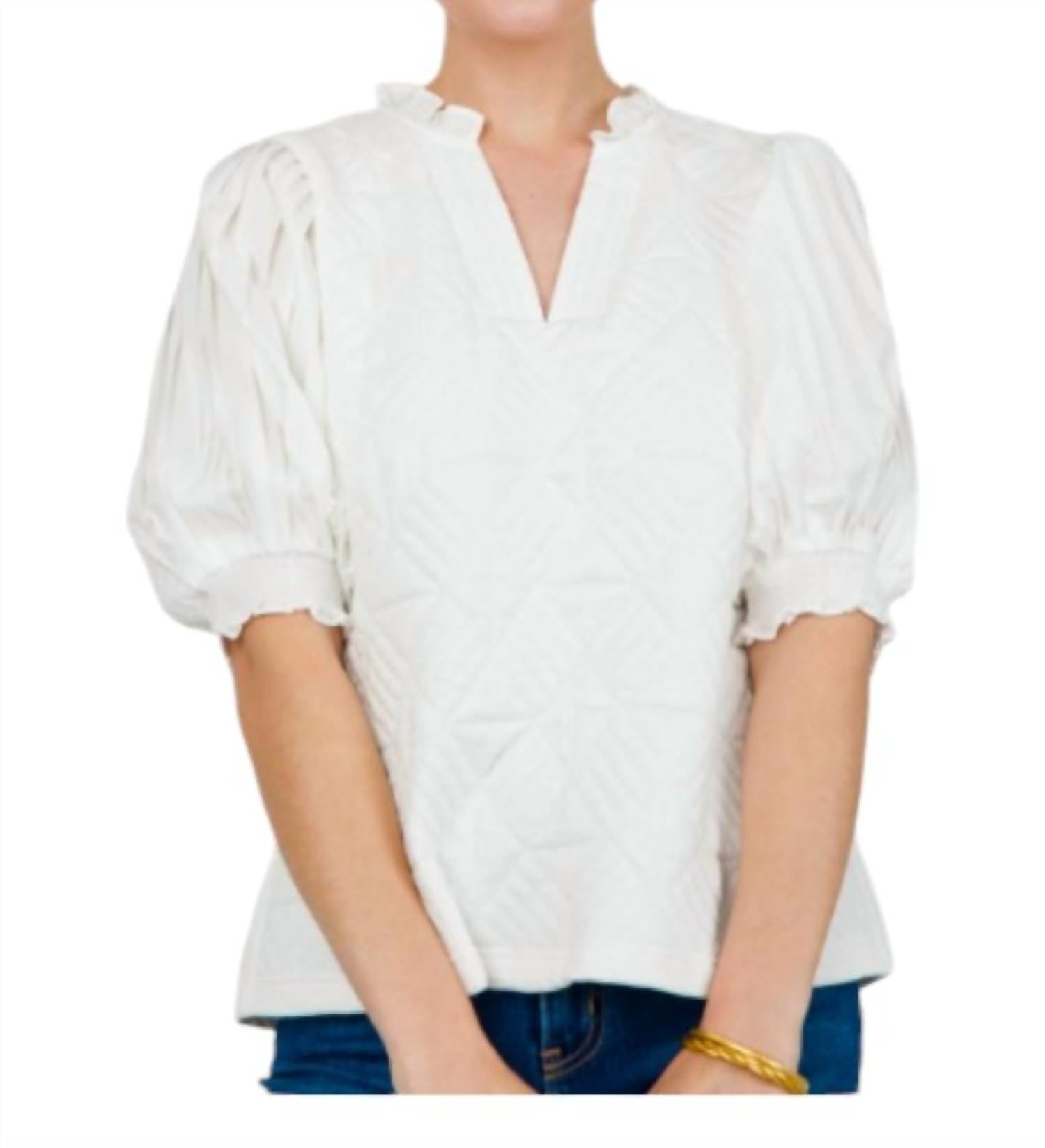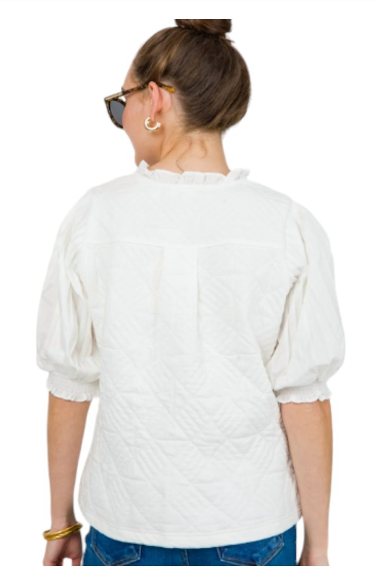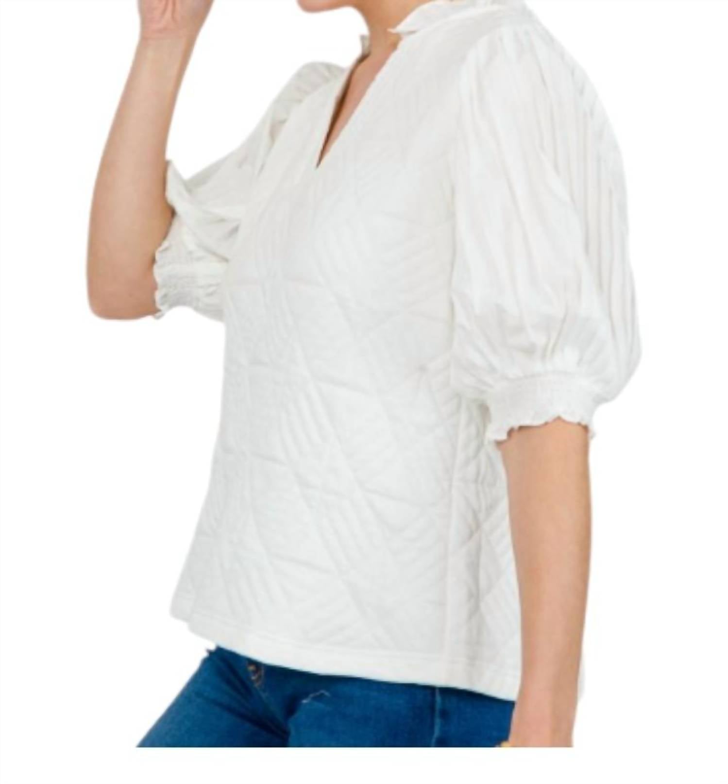 This classic, short sleeve tee will be your go-to staple this season and beyond.High-end loose-fitting quilted top with a thick knit-blend fabric. Pleated puff sleeves for a preppy, classic contrast. Ruffle collar for added style. Smocked sleeve cuffs. Knit body offers some stretch, while woven sleeves have no stretch. 55% polyester, 43% cotton, 2% spandex.
