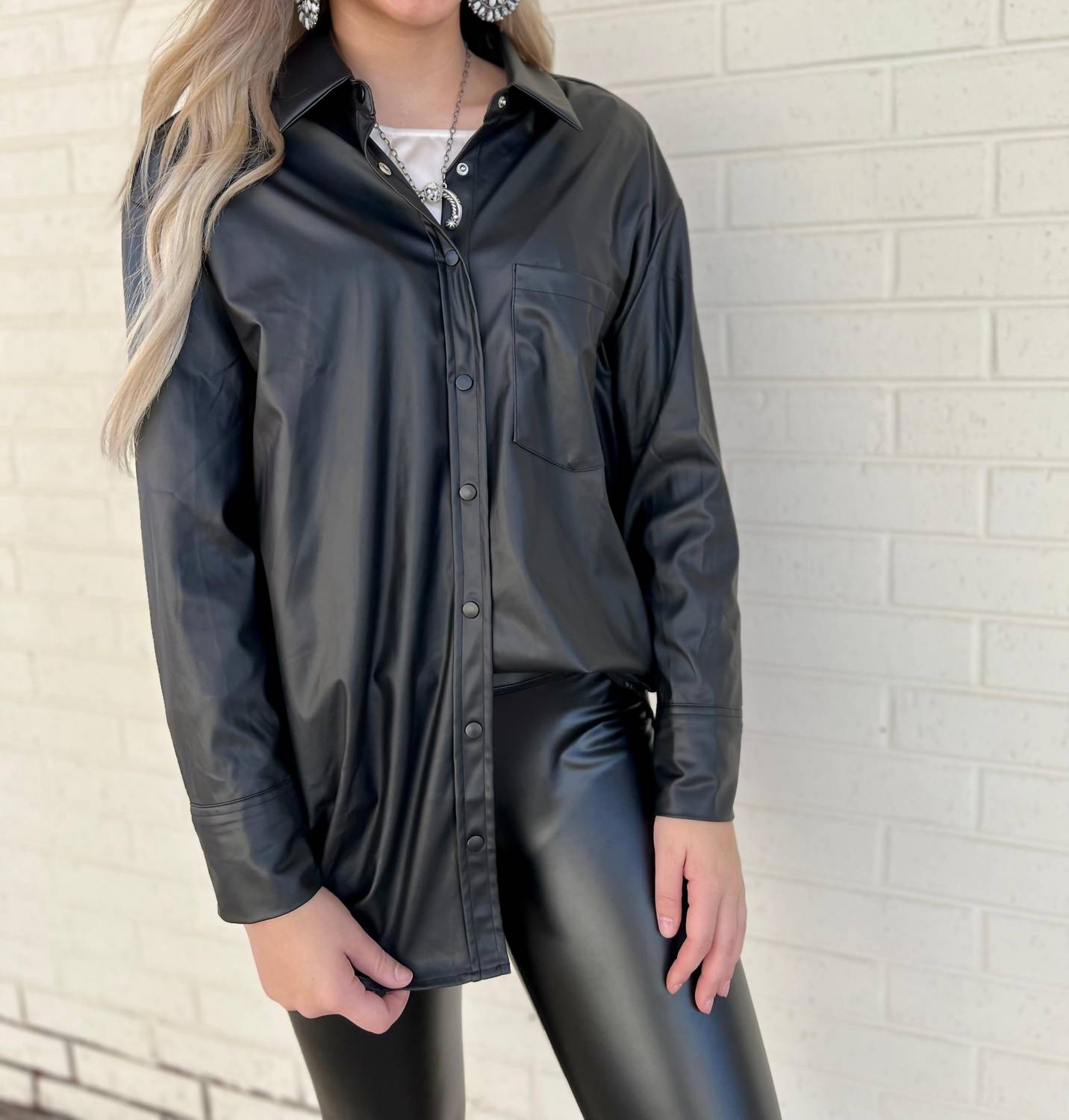 Perfectly tailored and soft to the touch. This women's button-down shirt in sleek black features long sleeves and is crafted from luxurious faux leather, ensuring you stand out with professional flair. It is designed with a practical front pocket and a stylish collar neckline, perfect for combining fashion with function. Finished with snap closure.
