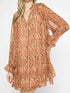 Introducing the Entro Print Long-sleeve Dress in a charming rust hue, ideal for a boho chic vacation look. This mini dress features a v-neckline and long sleeves with elastic at the wrists, ensuring comfort and style. Enjoy the added texture of a self-tie front and a fully lined interior for effortless wear. With a pull-on closure, this patterned patterned shift dress is perfect for summer adventures. Care instructions: Hand wash and line dry.