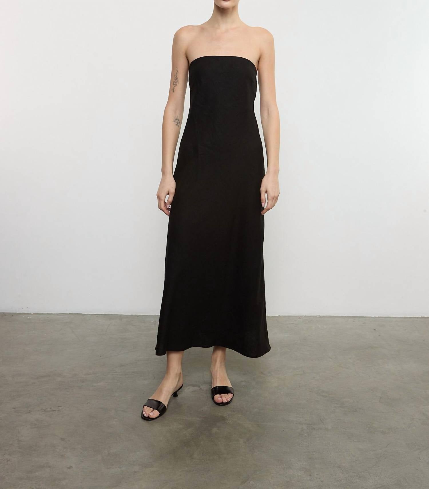 The Linen Bias Dress is crafted from 100% linen for comfort and breathability. Featuring a straight neckline, maxi length, and back zipper with hook closure.