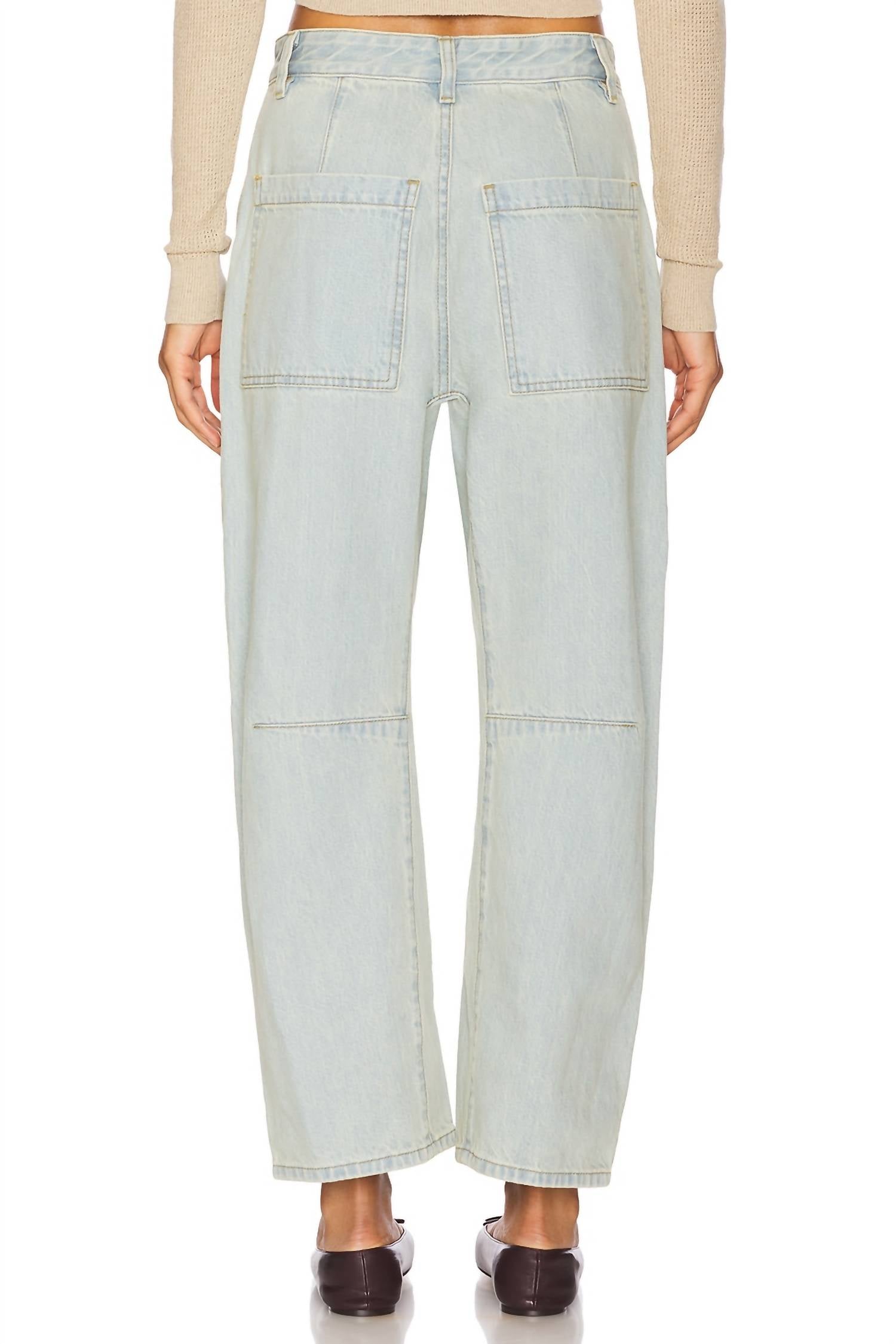 Introducing the Marine Utility Pant by Enza Costa in a charming Nostalgia Wash, crafted from 100% substantial cotton denim. These pants feature a barrel-shaped silhouette with a slight taper, complemented by knee seam details and functional front patch pockets. Designed with practicality in mind, they offer a high-rise fit with a 26" inseam and a zip closure. Made in USA. Machine wash.