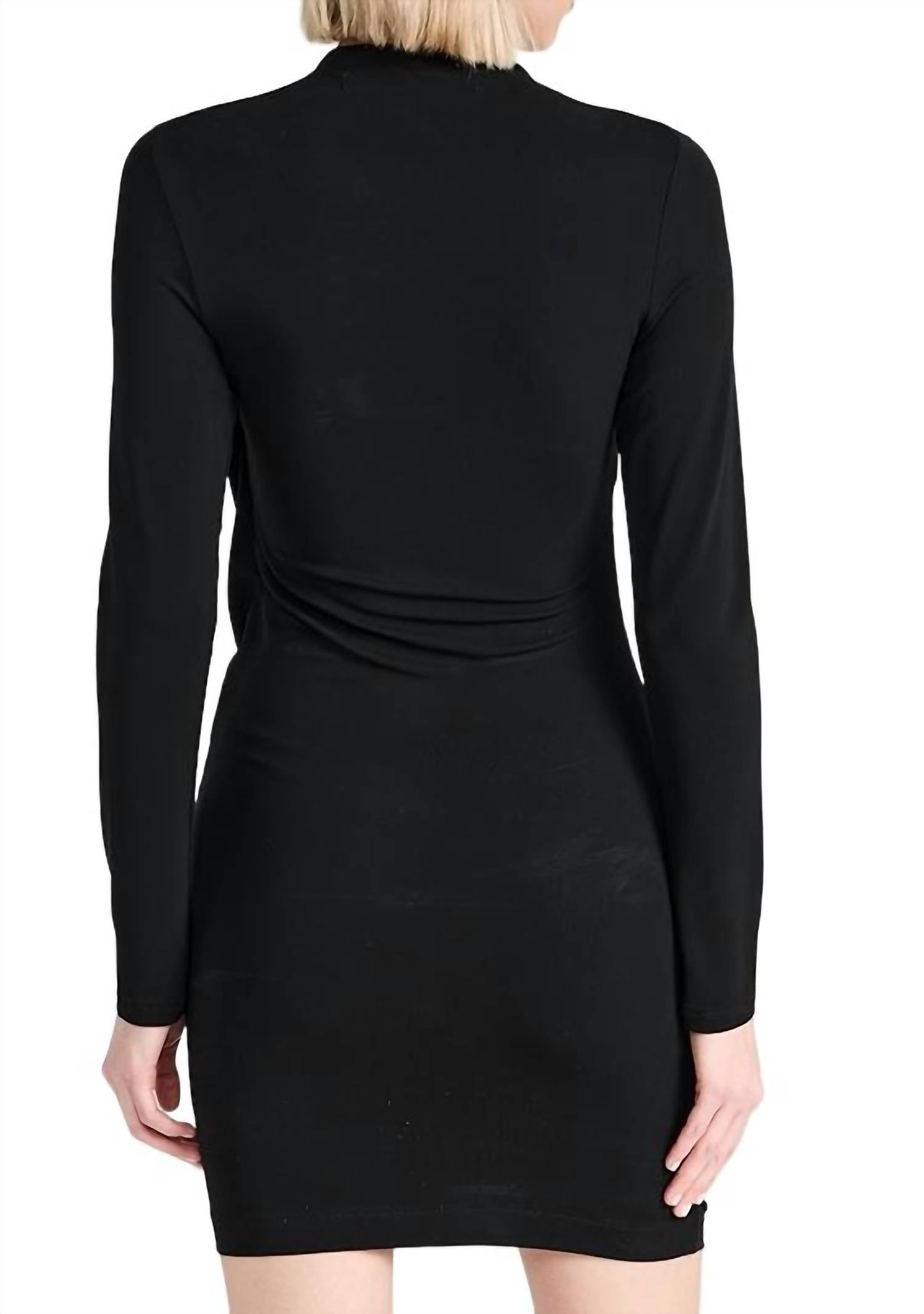 A short and breezy dress for those warmer days. Mid-weight slinky jersey with stretch. Crisscross ruching. V neck. Unlined. Long sleeves. Pullover design, no closure. 34.75" Length. Hand wash. 96% Viscose, 4% Spandex. Made in the USA.