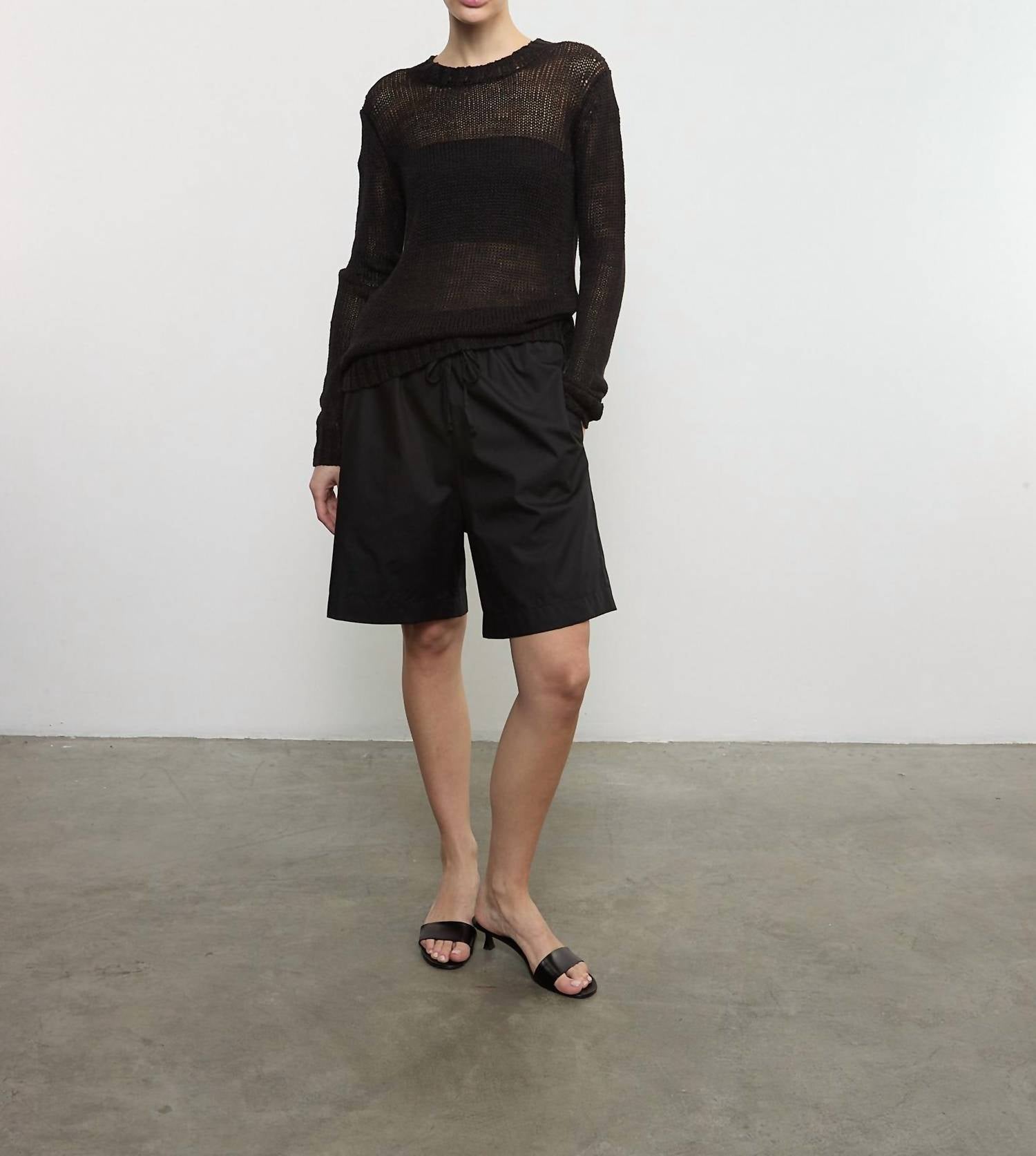 This knee-length poplin short features an elasticized waistband with tie front detail and functional side pockets.