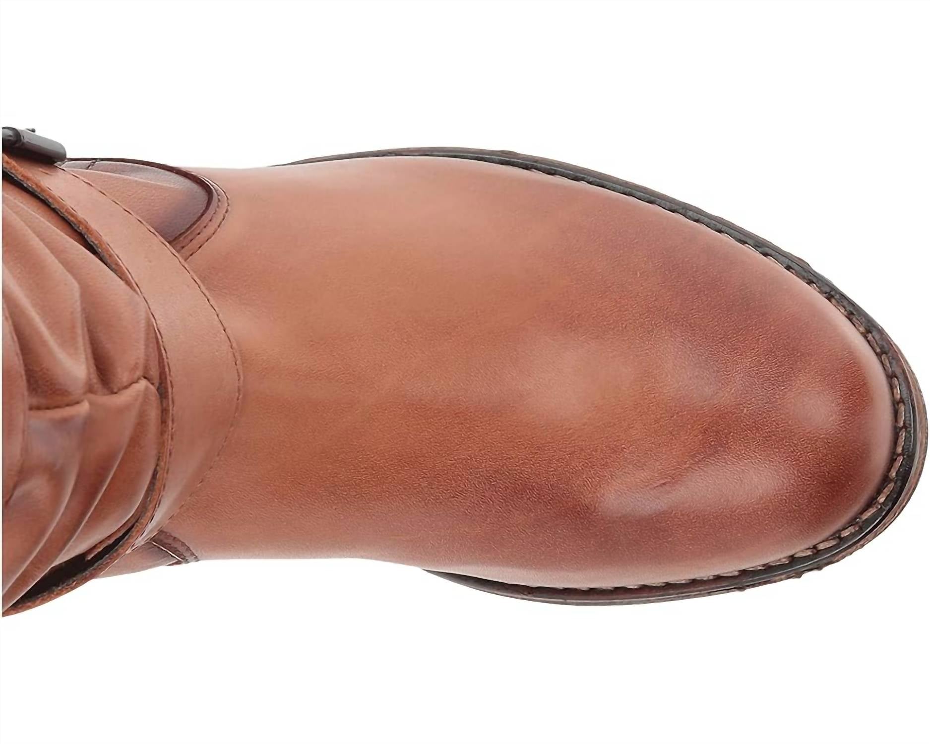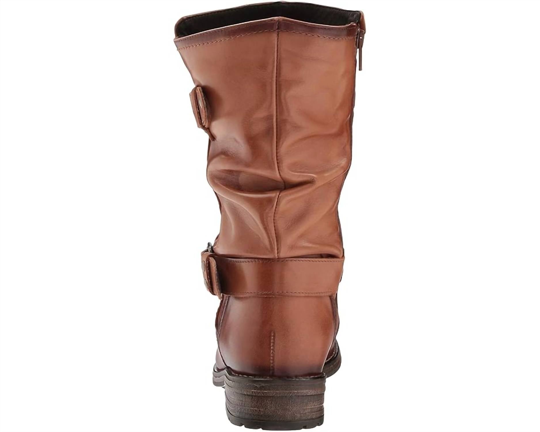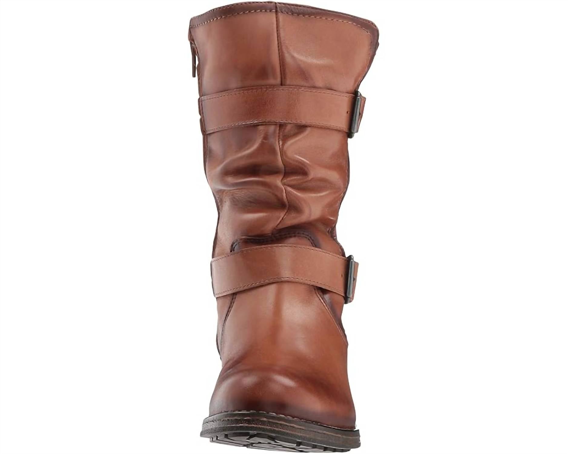 So versatile, you can wear these boots with your favorite jeans or even a dress for a more feminine feel.Unleash your inner renegade with the Eric Michael Women's Noelle Boots in stunning cognac. Designed for the modern woman who craves both comfort and style, these motorcycle boots feature a luxurious leather upper accented with adjustable buckles for that quintessential edgy aesthetic. The slouchy shaft adds a relaxed, yet fashionable flair, while the convenient zipper closure ensures effortless wear. Inside, the thin faux-fur lining provides just the right amount of warmth and comfort. Built for versatility, these boots come equipped with a treaded man-made outsole and a low block heel, making them perfect for everything from urban adventures to countryside escapes. Don't just step into any boot—stride confidently in the Noelle, where fierce meets functional. Imported and impeccably crafted, these boots are an essential addition to any bold wardrobe. Heel Height: 1.25". Weight: 15 oz. Circumference: 11". Shaft: 9.5". Platform Height: 0.5".