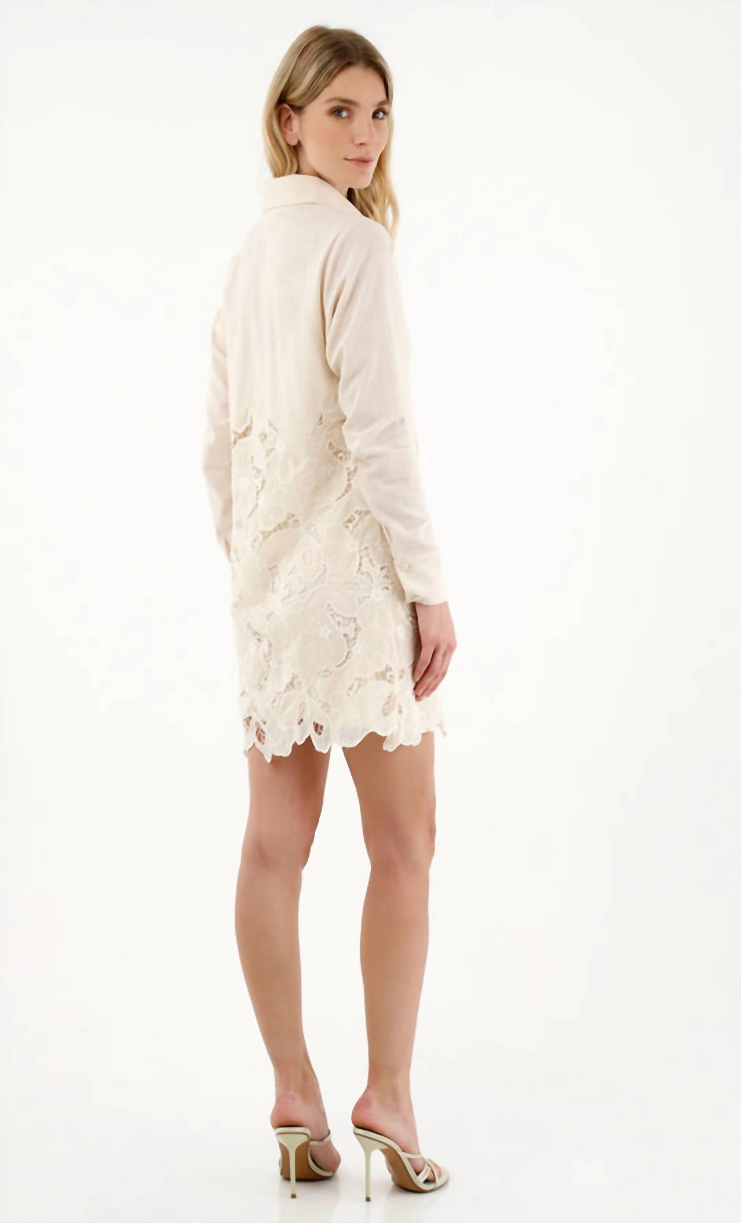 A short and breezy dress for those warmer days. Step into spring with the Shalimar Mini Dress by Especia, a tailored A-line silhouette perfect for a minimalist vacation wardrobe. This ivory dress features long sleeves and a chic collar, crafted from a comfortable cotton blend. The button closure adds a touch of sophistication, making it an ideal choice for Mother's Day outings. Designed for women who appreciate elegance, this textured dress embodies the essence of minimalist style.